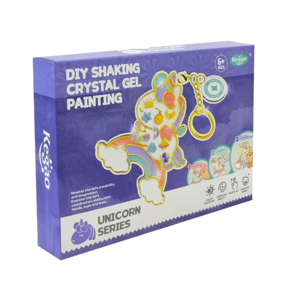 Створи власний маленький шедевр! Цей набір дозволяє дитині проявити фантазію та створити яскравий особистий брелок, який можна показати друзям або носити з собою.Комплектація:• 1 Прозора передня основа.• 1 Прозора задня основа.• 1 Аркуш з візерунками-наклейками.• 1 Брелок-кільце.• 4 Тюбики з гелевими фарбами.• Інструкція.Особливості:• 3 дизайни наборів на вибір: серія Milk Tea з веселим напоєм, Desserts з креативною тарілкою солодощів або Unicorn з милою фігуркою казкової тваринки.• Гелеве малювання — наносіть кольори прямо на прозору основу, створюючи кольорові елементи.• Готовий виріб можна трясти як сніжну кулю! Усередині рухаються маленькі декоративні частинки.• Брелок — готову роботу можна носити із собою або подарувати другу.• Нетоксичні гелеві фарби і міцна прозора основа забезпечують безпеку під час гри та довговічність виробу.Розвиток: координація рухів, уява, творче мислення, самовираження.Упаковка: коробка.