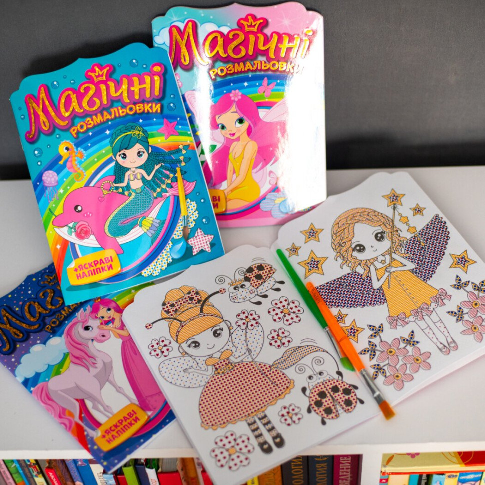 Книжечка-розмальовка з яскравими наліпками для дівчаток - чарівний формат творчості без фарб і олівців. Для створення кольорових малюнків потрібні лише вода та пензлик - і з цим впорається кожна дитина.