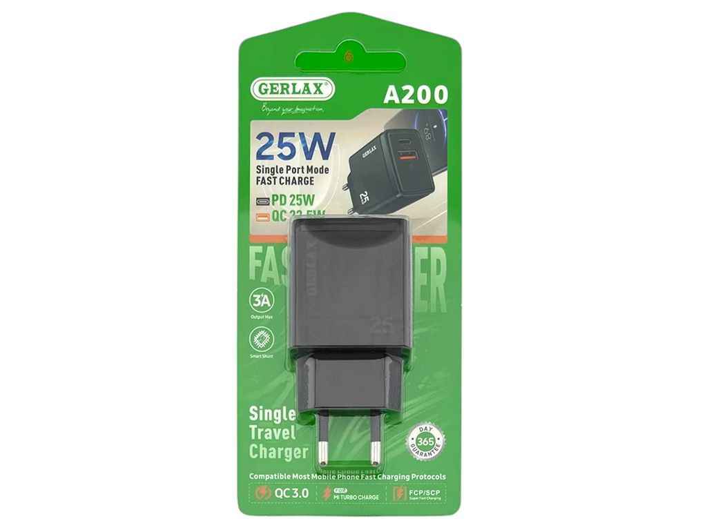 Мережевий зарядний пристрій USB A200 1USB/PD/25W чорний ТМ GERLAX