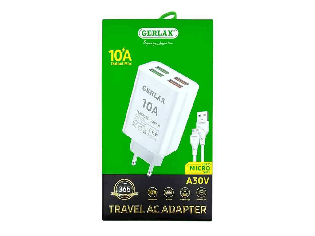 Мережевий зарядний пристрій microUSB A30V 10A/4USB/QC3.0 білий 1м ТМ GERLAX