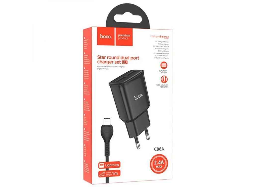 Мережевий зарядний пристрій для iPhone Lightning C88A 2.4A/2USB чорний 1м ТМ HOCO