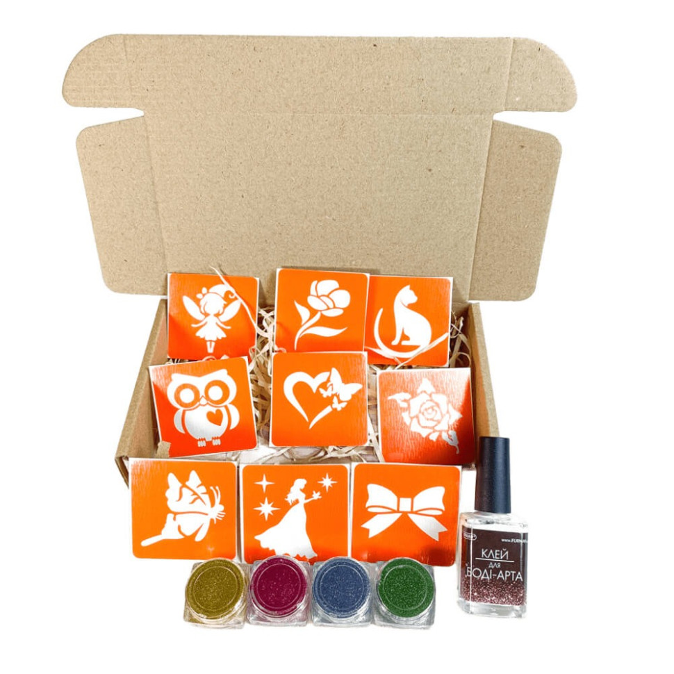 Набір для блиск-тату “Для дівчаток №3 – гліттер”Це яскравий творчий набір із дитячими трафаретами розміром 5×5 см, з якими легко та безпечно навчитися створювати модні блиск-тату. Ідеально підходить для домашньої творчості, свят, днів народження та веселих дівочих вечірок.Завдяки зручним трафаретам і насиченим гліттерам дитина зможе самостійно або разом з дорослими створювати красиві тимчасові татуювання з ефектом сяйваУ комплект входить:прозорий клей для боді-дизайну — 1 шт;гліттер (№6, №9, №10, №25, 25 g) — 4 шт;трафарети 5×5 см — 9 шт.У наборі достатньо гліттеру та багато трафаретів, щоб надовго вистачило для творчих експериментів. Усе акуратно упаковано та вже чекає на гарний настрій і фантазію!Чудова ідея подарунка для дівчаток, які люблять малювати, прикрашати себе та створювати щось яскраве власними руками.