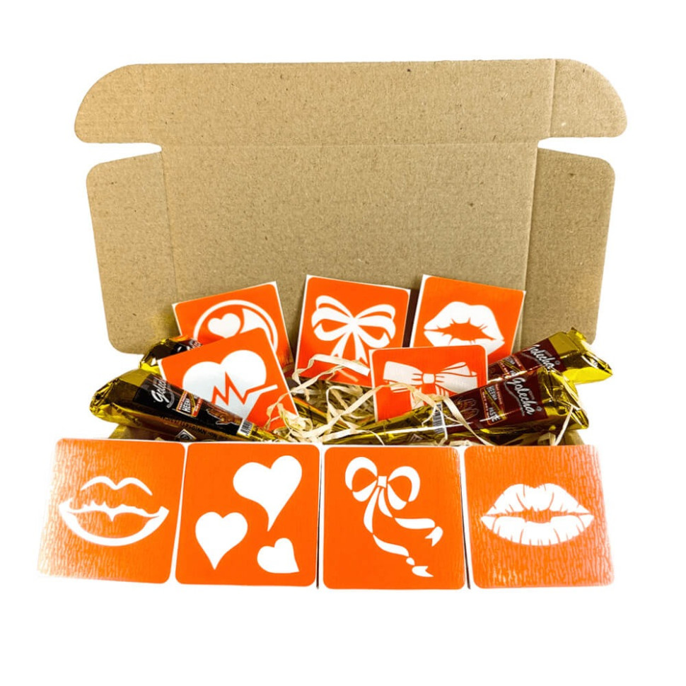 Комплектація набору:хна в конусі чорна — 2 шт;хна в конусі коричнева — 2 шт;трафарети для нанесення, розмір 5×5 см — 9 шт.Вага хни в одному конусі: 25 г.Застосування хни для біо-тату:Перед використанням обов’язково зробіть тест на алергічну реакцію.Наносьте хну на шкіру товстим шаром (для зручності можна використовувати трафарет).Через 20 хвилин після нанесення видаліть висохлу хну.Тільки для зовнішнього застосування.Як зробити біо-тату хною:Оберіть рівну ділянку шкіри.Ретельно очистьте та знежирте поверхню.Зніміть з трафарету білу підкладку (паперову основу).Приклейте трафарет на суху та знежирену шкіру.Обережно зніміть прозору плівку та переконайтеся, що трафарет (помаранчева частина) щільно прилягає до шкіри.Нанесіть хну товстим шаром на відкриту ділянку трафарету.Через 20 хвилин видаліть висохлу хну.Для чого потрібні трафарети:якщо немає навичок малювання від руки;якщо потрібно швидко та у великій кількості наносити малюнки;для створення однакових за розміром і виглядом зображень;трафарети Fresh Tattoo безпечні для шкіри та підходять для нанесення різних видів тимчасових тату: гліттер-тату, хною, оксамитом, пігментом, джагуа-гелем тощо;підходять для хімічного або піскоструминного матування виробів зі скла (чашки, келихи, дзеркала).