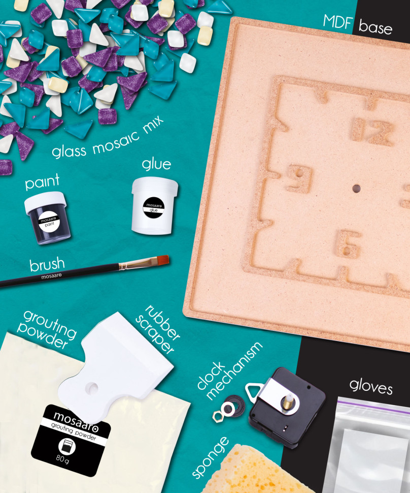 Набір скляної мозаїки «Годинник (квадратний)».Особливості: усе, що потрібно, — є в наборі.Розмір коробки: 316 х 316 х 64 мм.Набір містить: основу з МДФ, набір скляної мозаїки, клей на водній основі, акрилову фарбу, пензлик, шпатель, суміш для затирання швів, дерев’яну паличку для замішування, рукавички, губку, годинниковий механізм з кріпленням, мірну ложку, мішечок, попередження, інструкцію.Вік: 8-99 років.