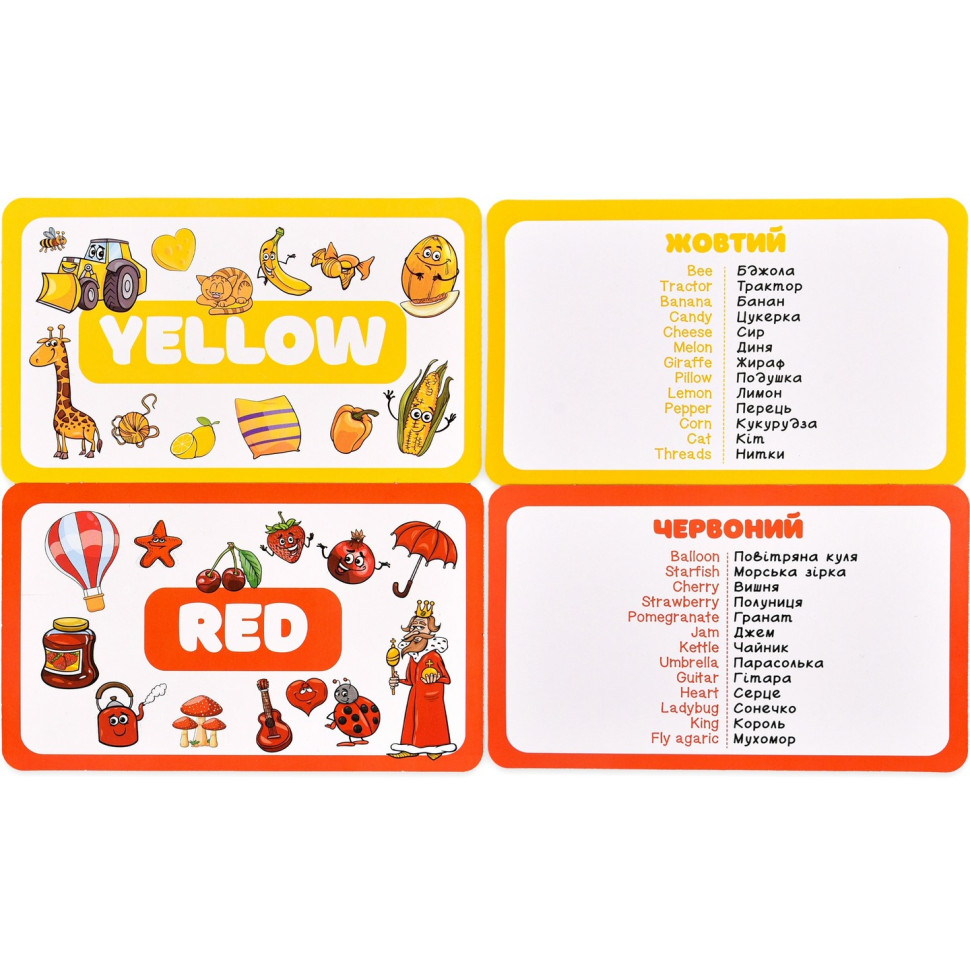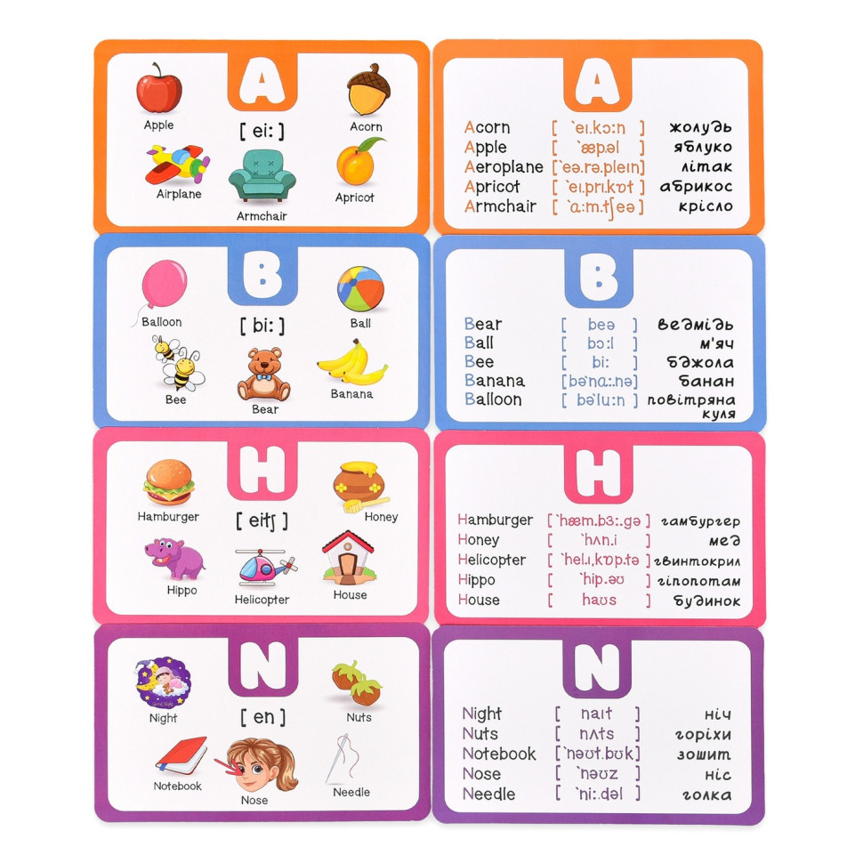 "Англійська абетка" — це ігровий набір для ефективного вивчення англійської мови та розвитку кругозору дитини. У грі 26 карток з літерами англійського алфавіту, 7 карток з днями тижня та 7 карток кольорів. Кожна картка доповнена яскравим малюнком, словом, транскрипцією та перекладом для швидкого поповнення словникового запасу та правильної вимови.