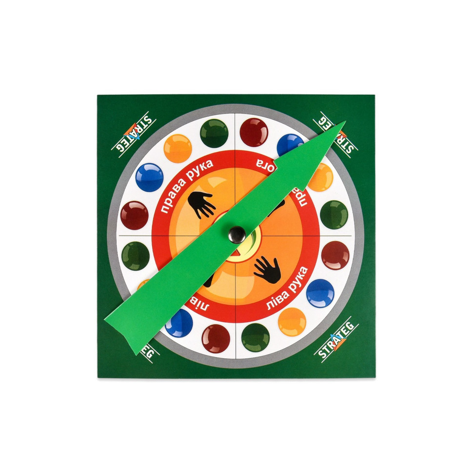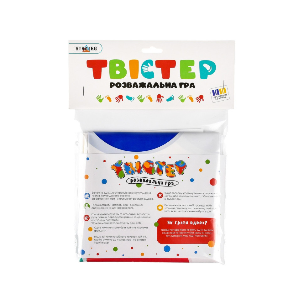 "Твістер" — рухлива гра для компанії, яка дарує сміх і веселощі. Весела гра змусить вас крутитися, тягнутися і сміятися! Гравці мають ставити руки й ноги на кольорові кола, не падаючи й не заплутуючись. Ідеально для активного дозвілля вдома або на природі, для дітей та дорослих. Для дітей від 5 років і дорослих.
