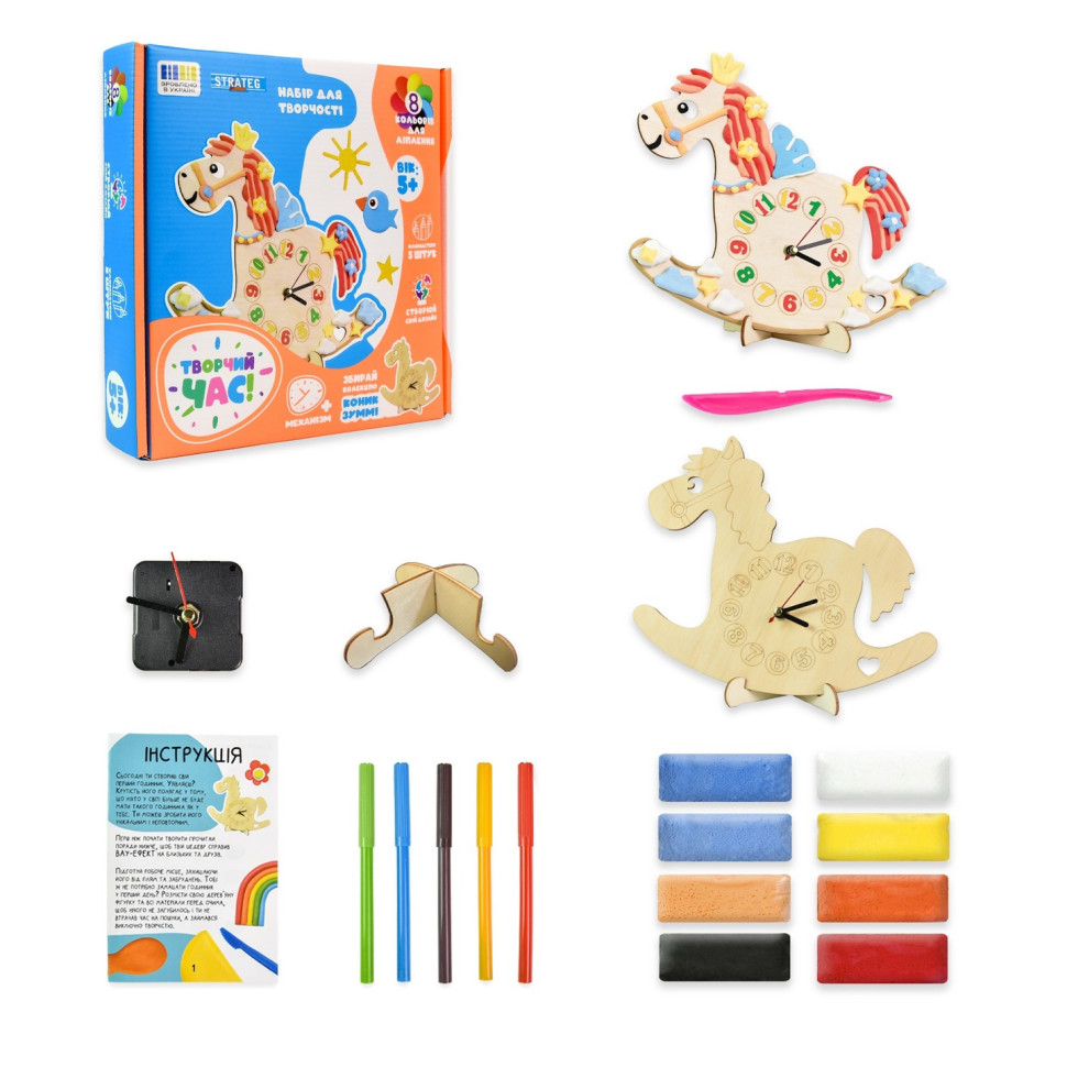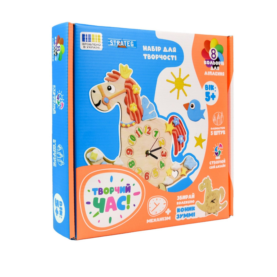 Набір для творчості "Творчий час. Коник Зуммі" — це чудова можливість створити свій власний унікальний годинник. Він стане прикрасою дитячої кімнати та допоможе малюку вивчити час. У наборі на вас чекає дерев'яна основа коника, годинниковий механізм, а ще повітряна маса та фломастери для прикрашання.