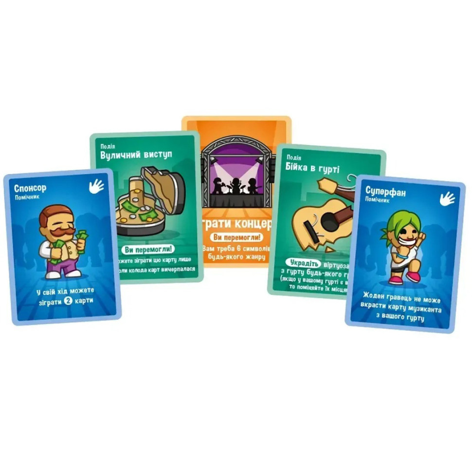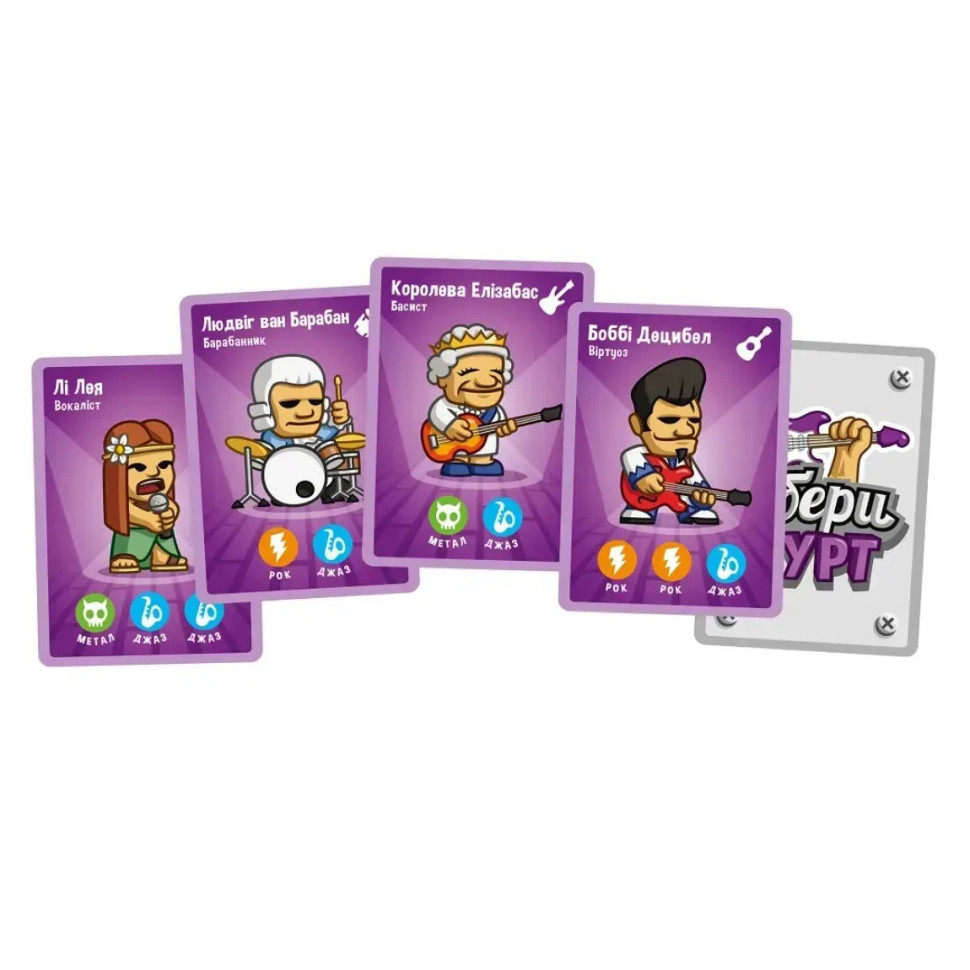 Багато хто з нас колись мріяв освоїти музичний інструмент і виступати в гурті, створюючи справжнє мистецтво. Збери Гурт (Band Grab) наблизить гравців до світу великої музики та дозволить весело провести вечір у гарній компанії. Учасникам доведеться шукати кращих музикантів, щоб об'єднати їх разом та створити легендарний гурт, ім’я якого буде вписане в історію.У картковій стратегії можуть брати участь до шести гравців, яким динамічні партії точно не залишать часу для нудьги. Хоча гра й має прості правила і зрозумілу структуру ходу, при цьому вона залишає достатньо можливостей для планування, втілення в життя різних стратегій, напруженого протистояння, підступних інтриг і може похизуватися високою реграбельністю.Творіть історію музики власноручЗбери Гурт - захоплююча сімейна гра, яка відмінно підійде і навіть об'єднає гравців різного віку, для веселих компаній, затятих "настільників" або новачків. Вона одночасно весела та запекло змагальна.У коробці на вас чекає 72 карти із зображеними на них музикантами. Більшість із них грають у різних стилях, тому навряд чи зможуть ужитися разом і створювати по-справжньому хорошу музику. Щоб зібрати власний гурт, гравцям необхідно об'єднати разом прихильників одного стилю та сприяти тому, аби вони почали грати свої пісні. Для справжнього колективу доведеться добренько пошукати барабанщика, басиста, віртуоза та інших майстрів своєї справи в залежності від обраного стилю. Звичайно ж, гурт не обійдеться і без вокаліста.Є кілька основних типів карток:- Карти музикантів, які грають у різних стилях.- Картки "Події", які дозволяють красти музикантів у суперників, влаштовувати бійки в групі, заважати іншим учасникам здобути перемогу і не тільки.- Картки "Помічників", які відкривають унікальні можливості, наприклад, дозволяють зіграти дві карти за хід або перешкодити опонентам вкрасти у вас карту з музикантом.Зіграйте свій перший концерт!Просто зібрати учасників разом недостатньо, оскільки це було б занадто просто. На кожній карті музиканта є спеціальні символи, які також називають значками жанру. Для перемоги гравець має зробити так, щоби гурт зіграв свій перший концерт. Як тільки колектив збере шість однакових символів жанру, він отримає можливість розіграти концертну карту, здобувши першість у напружених перегонах.Одна партія може займати від 15 до 45 хвилин і підійде навіть для двох гравців, але досвід гри в компанії обіцяє бути веселішим. Хоча гра здається максимально простою, а розібратися з правилами можна в процесі, вона забезпечує унікальний ігровий досвід під час кожної нової партії. Завдання полягає не лише в тому, щоб зібрати гурт і змусити його зіграти концерт для шанувальників. Важливо зробити так, щоб суперники не встигли досягти визначних результатів першими. А для цього доведеться думати наперед, прораховувати можливі дії опонентів, грамотно і вчасно розігрувати карти. Незважаючи на планування і стратегію, деякі речі все одно не можна контролювати, тож доведеться довіритися рандому.Беріть у руки колоду, знайомтеся ближче із кумедними персонажами та обирайте улюблений стиль музики, аби створити свою ідеальну групу. Приготуйтеся до веселощів, підступних витівок опонентів і до того, як непомітно пролітає час за кожною новою партією.