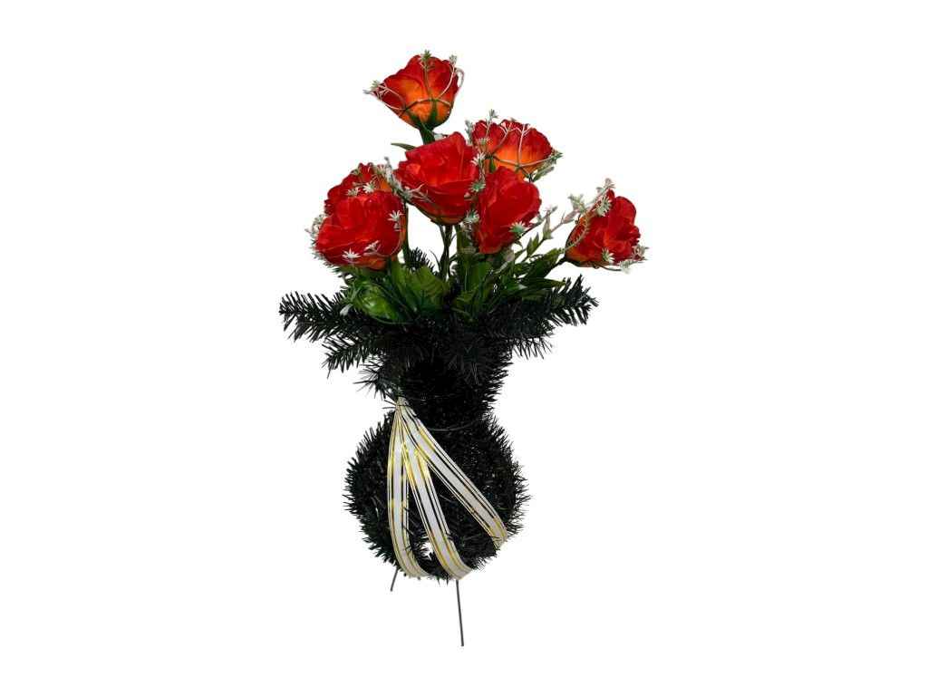 Ваза з квітами «Троянди» — це витончена композиція, що поєднує стриманість, гідність та глибоку символіку пам’яті. Виріб оформлений у класичному стилі з декоративною хвойною основою та композицією троянд, які символізують повагу, любов і світлу пам’ять. Квіти гармонійно поєднані з зеленим листям, а декоративна стрічка додає завершеності та акуратного вигляду. Композиція підходить для покладання на могилу, участі в похоронній церемонії або в поминальні дні.