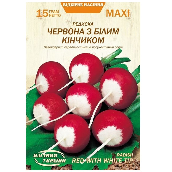 Редис ЧЕРВОНИЙ З БІЛИМ КІНЧИКОМ 15г Максі (10 пачок) ТМ НАСІННЯ УКРАЇНИ