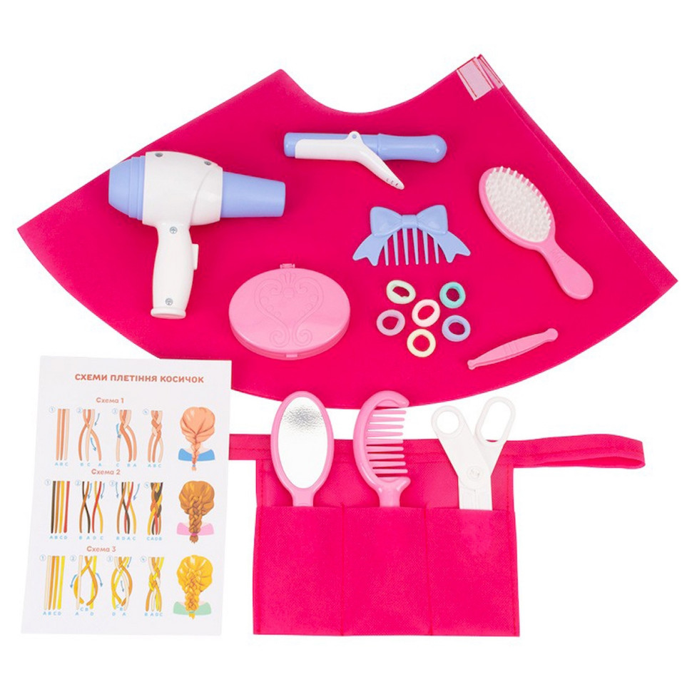 У наборі є все необхідне для справжнього перукаря: фен, плойка, гребінець, щітка, дзеркальце, ножиці та інші аксесуари. Завдяки спеціальному поясу з кишеньками усі інструменти завжди будуть під рукою, а накидка для клієнта допоможе зробити гру ще більш реалістичною.