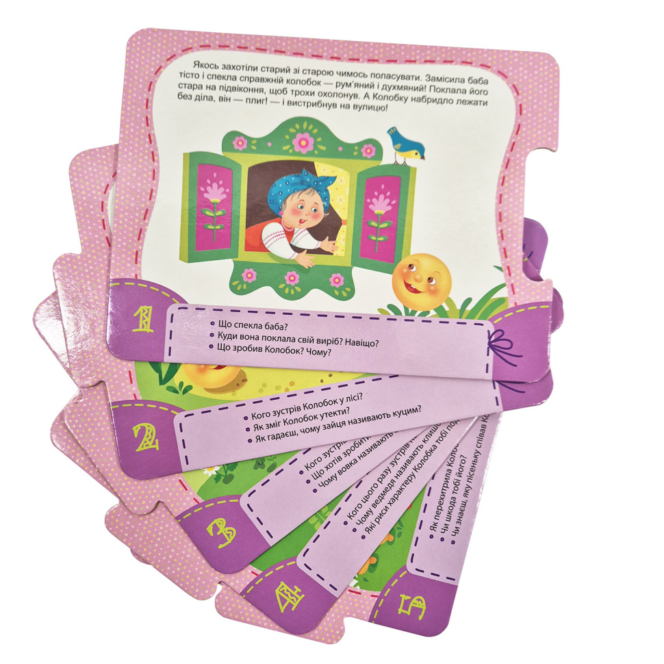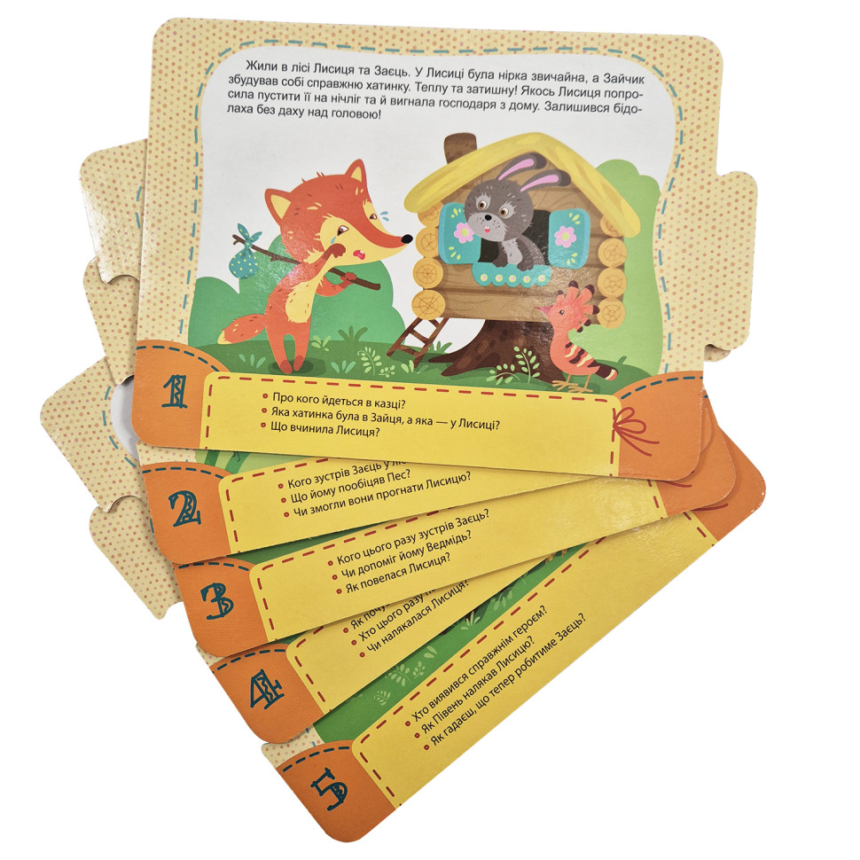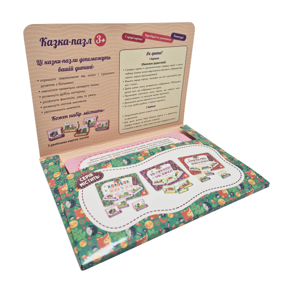 Ілюстрації улюбленних дитячих казок розташовані на 5 картках-пазлах.В наборі йде дві казки (з лицьової сторони та на звороті). Окрім сюжетних зображень та тексту казки на кожній картці знаходяться декілька запитань стосовно того, що зображено. Вони направлені на розвиток логічного мислення, фантазії та уважності. Пазли змодельовані таким чином, що дитина зможе скласти свій сюжет казки, розташовавши картки за власним бажанням і фантазією.