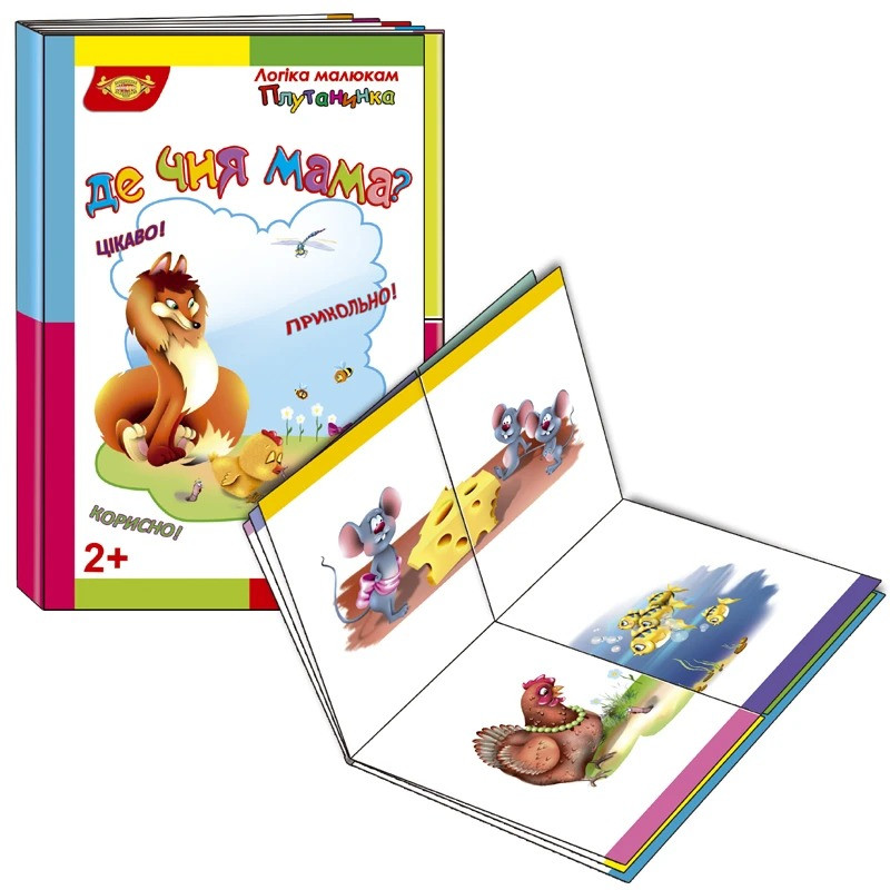 Книга «Логіка малюкам. Плутанинка: Де чия мама?»Допоможіть малюкові поєднати родини тварин у цій захопливій грі-головоломці! Книга «Де чия мама?» - це ідеальне поєднання навчання та розваги, розроблене спеціально для найменших дослідників.Що всередині?Це інтерактивна книжка-гра, де сторінки розрізані на частини. Головне завдання дитини - правильно перегортати елементи, щоб знайти пару: маму та її дитинча.Головні переваги:Розвиток логіки та уваги: Дитина вчиться зіставляти деталі, шукати спільні ознаки та виправляти помилки (ту саму «плутанинку»).Пізнання світу: Малюк запам'ятовує назви тварин та їхніх малят у легкій ігровій формі.Дрібна моторика: Гортання окремих частин сторінок тренує пальчики та координацію рухів.Якісне виконання: Цупкий картон та яскраві, зрозумілі дітям ілюстрації, що витримають багато годин активної гри.