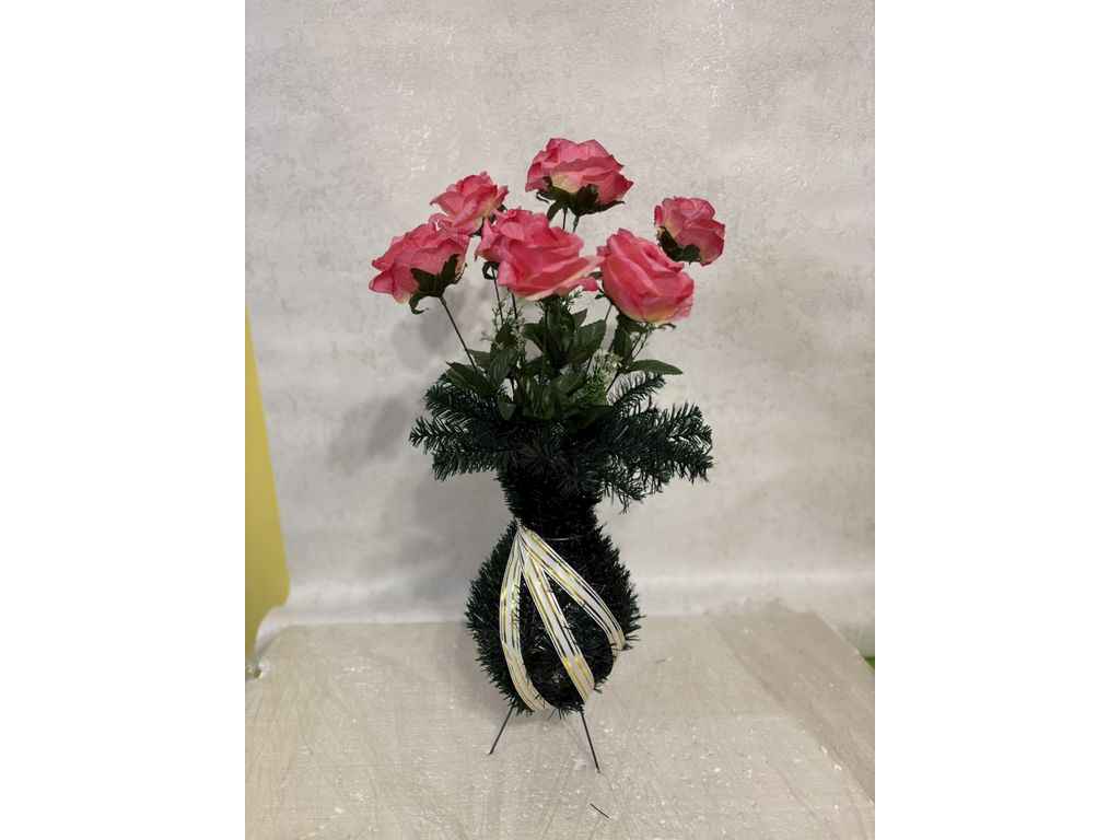 Ваза з квітами «Троянди» — це витончена композиція, що поєднує стриманість, гідність та глибоку символіку пам’яті. Виріб оформлений у класичному стилі з декоративною хвойною основою та композицією троянд, які символізують повагу, любов і світлу пам’ять. Квіти гармонійно поєднані з зеленим листям, а декоративна стрічка додає завершеності та акуратного вигляду. Композиція підходить для покладання на могилу, участі в похоронній церемонії або в поминальні дні.