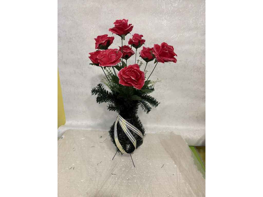 Ваза з квітами «Троянди» — це витончена композиція, що поєднує стриманість, гідність та глибоку символіку пам’яті. Виріб оформлений у класичному стилі з декоративною хвойною основою та композицією троянд, які символізують повагу, любов і світлу пам’ять. Квіти гармонійно поєднані з зеленим листям, а декоративна стрічка додає завершеності та акуратного вигляду. Композиція підходить для покладання на могилу, участі в похоронній церемонії або в поминальні дні.