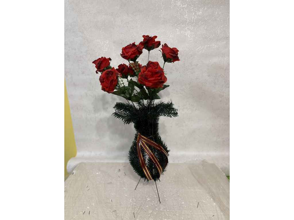 Ваза з квітами «Троянди» — це витончена композиція, що поєднує стриманість, гідність та глибоку символіку пам’яті. Виріб оформлений у класичному стилі з декоративною хвойною основою та композицією троянд, які символізують повагу, любов і світлу пам’ять. Квіти гармонійно поєднані з зеленим листям, а декоративна стрічка додає завершеності та акуратного вигляду. Композиція підходить для покладання на могилу, участі в похоронній церемонії або в поминальні дні.