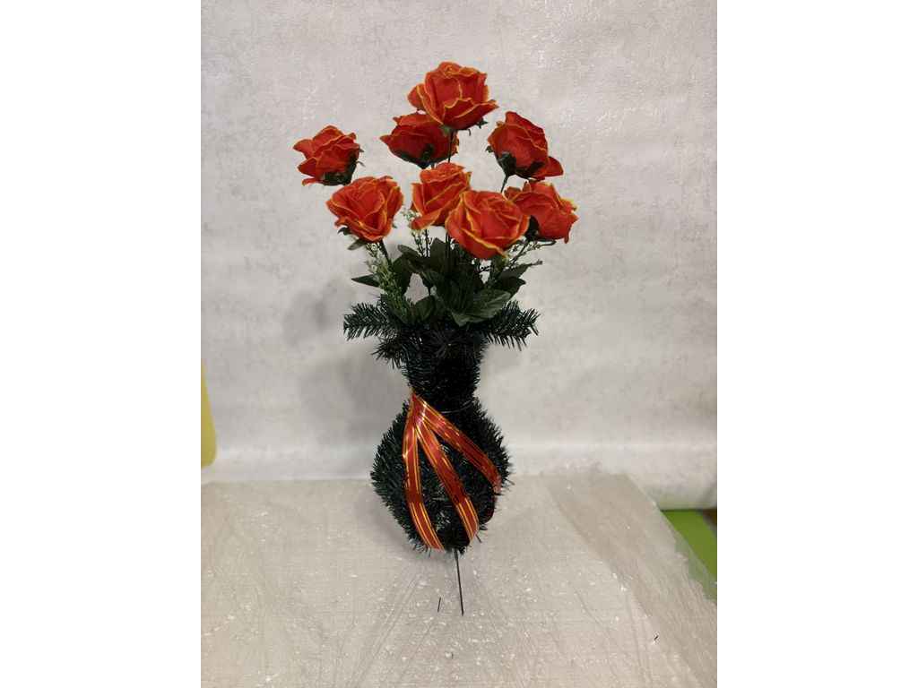 Ваза з квітами «Троянди» — це витончена композиція, що поєднує стриманість, гідність та глибоку символіку пам’яті. Виріб оформлений у класичному стилі з декоративною хвойною основою та композицією троянд, які символізують повагу, любов і світлу пам’ять. Квіти гармонійно поєднані з зеленим листям, а декоративна стрічка додає завершеності та акуратного вигляду. Композиція підходить для покладання на могилу, участі в похоронній церемонії або в поминальні дні.