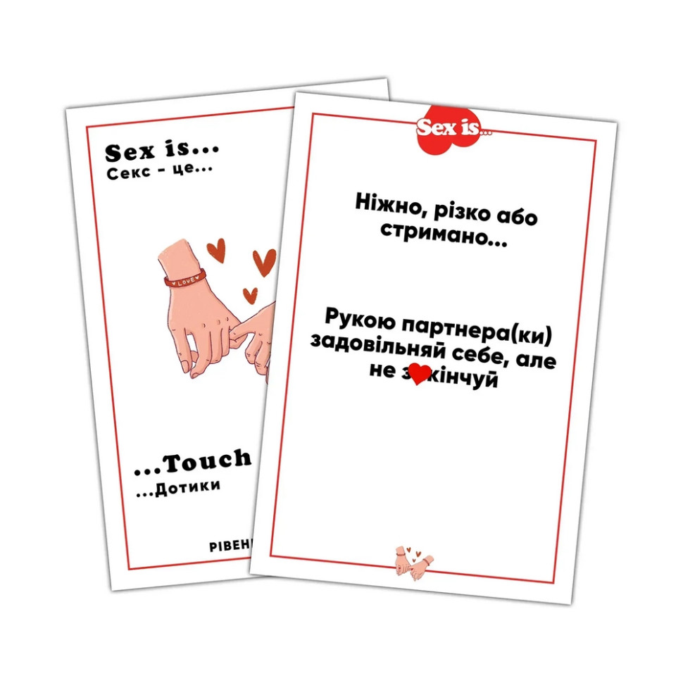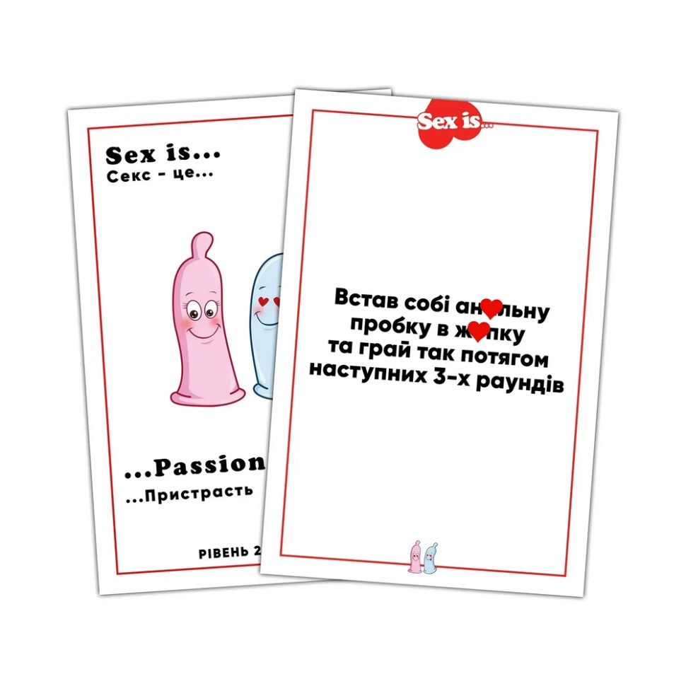«Sex is…» - Настільна гра в ліжку, яка охоплює всі етапи інтимного життя, тому тут 200 дуже відвертих завдань та запитань, представлені у 2 рівнях складності (Easy / Hard) та аж у 5 категоріях:Sex is… Поцілунки; Sex is… Пристрасть; Sex is… Розмови; Sex is… Відчуття; Sex is… Дотики.А також додаткова категорія «Sex is… Бажання», яка створена для ваших власних ідейВам не потрібно ніяких додаткових аксесуарів, адже у наповненні тут також зібрано вже все необхідне:Ігрове поле зі спінером, картки, правила, презервативи, пірʼїнка, повʼязка, лубрикант, волога серветка, прищіпки, анальна пробка.Просто крутіть стрілку, потрапляйте на категорії та насолоджуйтесь найкращими моментами разом зі своєю коханою людиноюДо речі, це перша інтимна настільна гра, яка розрахована для будь-яких пар! (Традиційних та одностатевих)