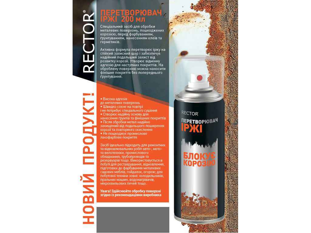 Перетворювач іржі RECTOR —спеціальний засіб для обробки металевих поверхонь, пошкоджених корозією, перед