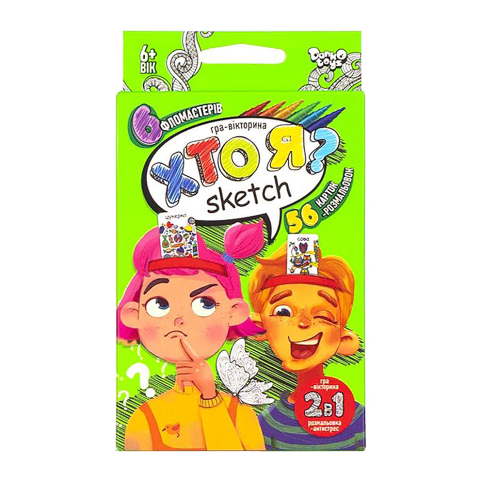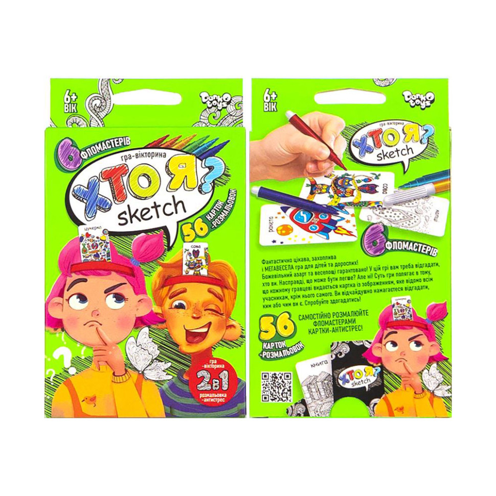 Розважальна та розвивальна настільна гра "Хто Я? Sketch". Фантастично цікава , захоплива і мегавесела гра для дітей та дорослих. У цій грі вам треба відгадати, хто ви. Суть гри полягає в тому, що кожному гравцеві видається картка із зображенням, яке відомо всім, крім нього самого. В комплекті 6 фломастерів та 56 карток-антистрес, які ви можете розмалювати самостійно. Мова оформлення українська. Розмір коробки 13,5х9,5х2,5 см. Вік 6+