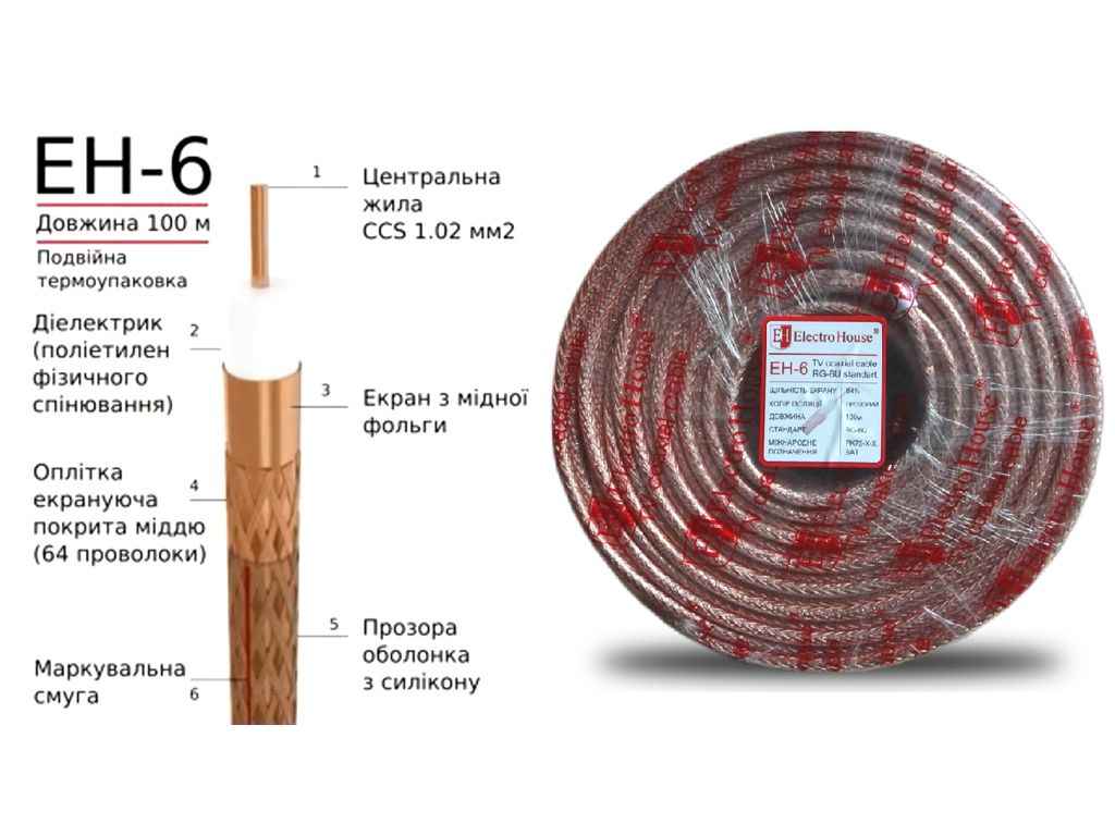 Кабель коаксіальний (телевізійний) RG-6U обміднена сталь 1.02 силікон 77 Ом (64 жили) прозорий 100м ЕН-6 ТМ ELECTROHOUSE