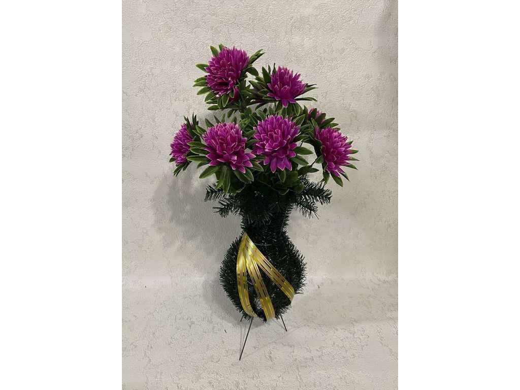 Ваза з квітами «Хризантеми» — це витончена композиція, що поєднує стриманість, гідність та глибоку символіку пам’яті. Виріб оформлений у класичному стилі з декоративною хвойною основою та композицією хризантем, які символізують повагу, любов і світлу пам’ять. Квіти гармонійно поєднані з зеленим листям, а декоративна стрічка додає завершеності та акуратного вигляду. Композиція підходить для покладання на могилу, участі в похоронній церемонії або в поминальні дні.
