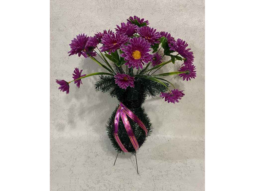 Ваза з квітами «Ромашки» — це витончена композиція, що поєднує стриманість, гідність та глибоку символіку пам’яті. Виріб оформлений у класичному стилі з декоративною хвойною основою та композицією ромашек, які символізують повагу, любов і світлу пам’ять. Квіти гармонійно поєднані з зеленим листям, а декоративна стрічка додає завершеності та акуратного вигляду. Композиція підходить для покладання на могилу, участі в похоронній церемонії або в поминальні дні.