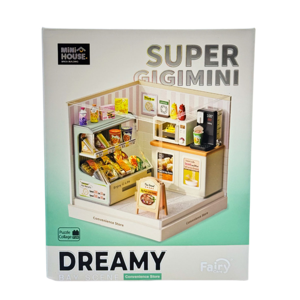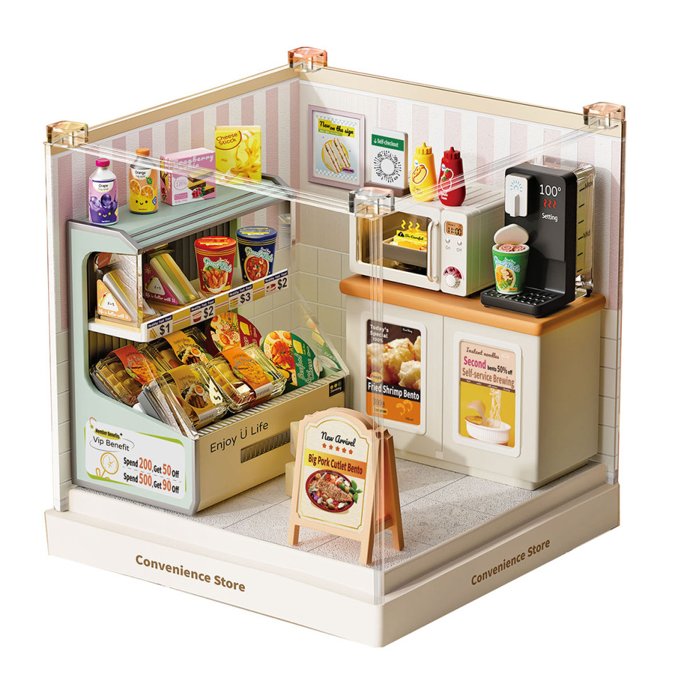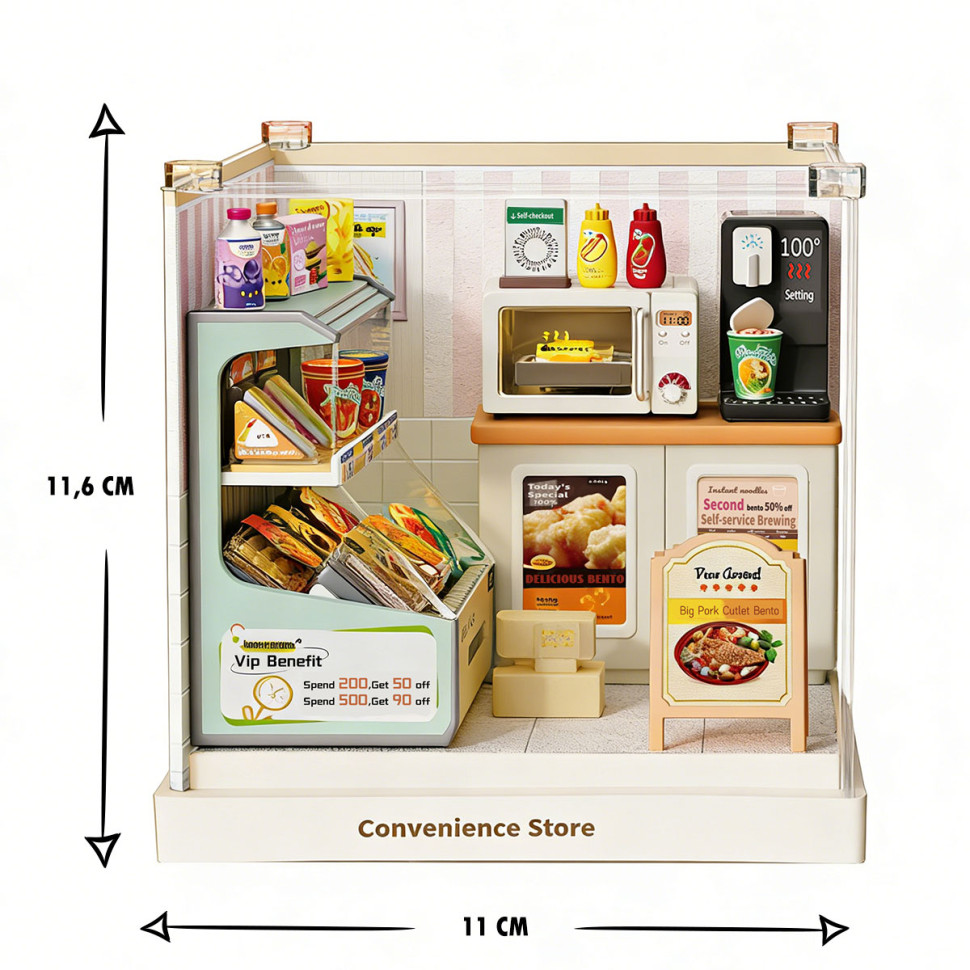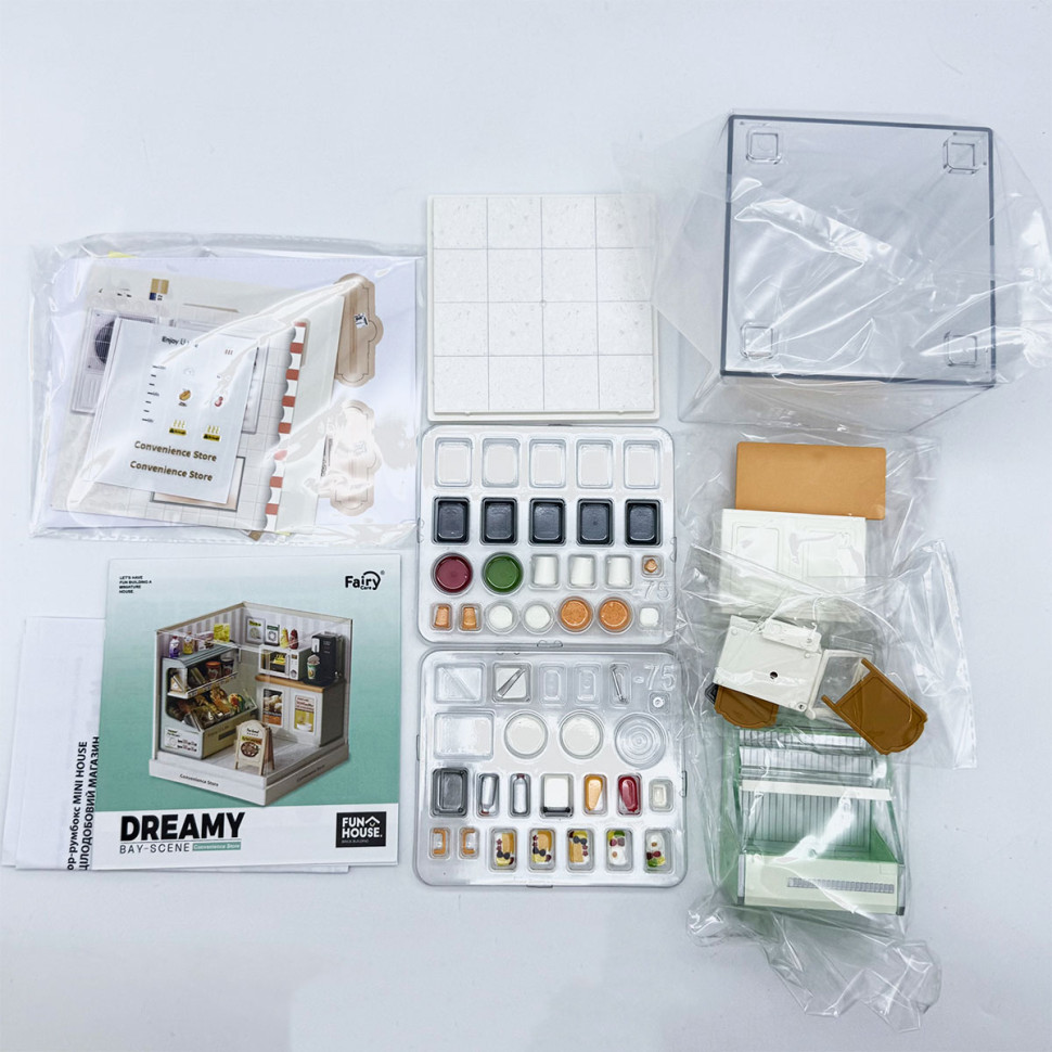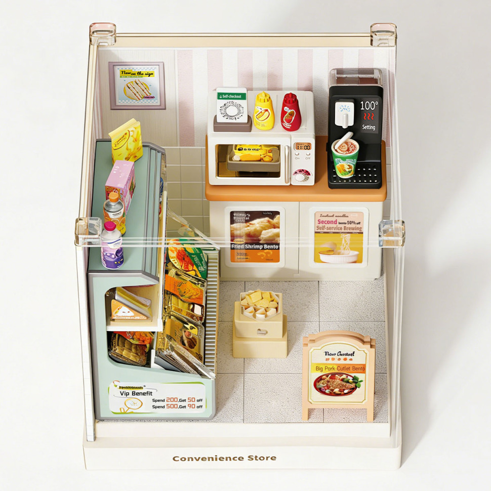 В наборе воссоздана атмосфера игрушечного небольшого магазина с прилавком, витринами и полками с товарами. Миниатюрные упаковки, напитки, снеки, кофейная зона и кассовые элементы формируют узнаваемое пространство повседневных покупок и добавляют сцене реалистичности. Прозрачный бокс позволяет рассматривать интерьер как коллекционный объект или элемент декора.