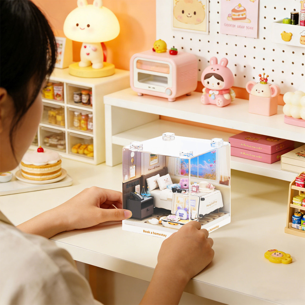 Конструктор-румбокс MINI HOUSE серії 'Інтер'єр Міні' – ГОТЕЛЬНИЙ НОМЕР – набір для самостійного складання мініатюрного інтер’єру готельного номера в прозорому боксі. Поетапно зберіть елементи конструктора, сформуйте простір номера та розмістіть деталі всередині боксу, створивши завершену мінісцену!