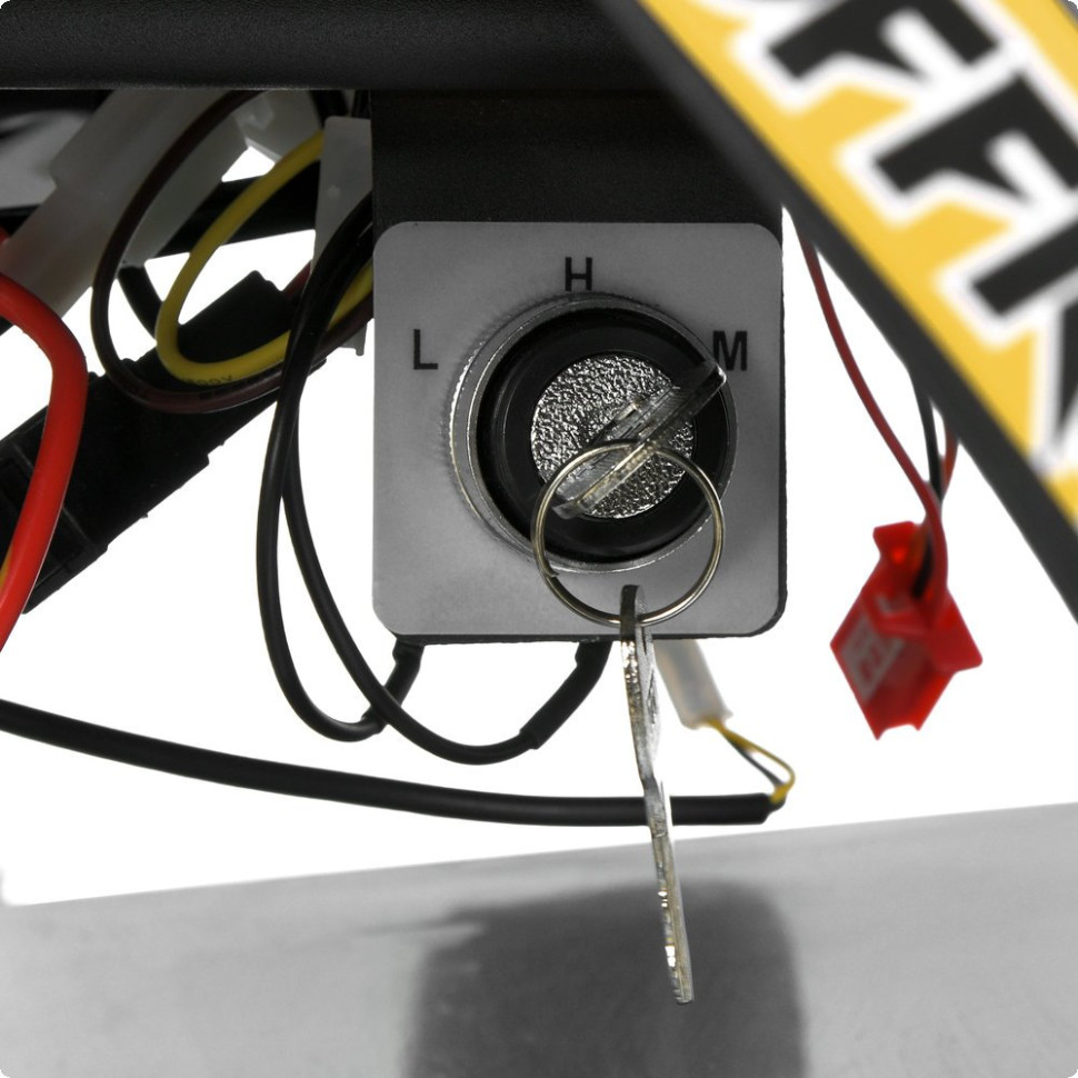 Модель оснащена потужним електродвигуном на 1000W, що дозволяє розвивати швидкість до 25 км/год. Передбачено три швидкісні режими з можливістю перемикання, що дає змогу адаптувати поїздку під рівень підготовки дитини. Запуск здійснюється поворотом ключа, керування - за допомогою ручки газу та тумблера руху вперед/назад.
