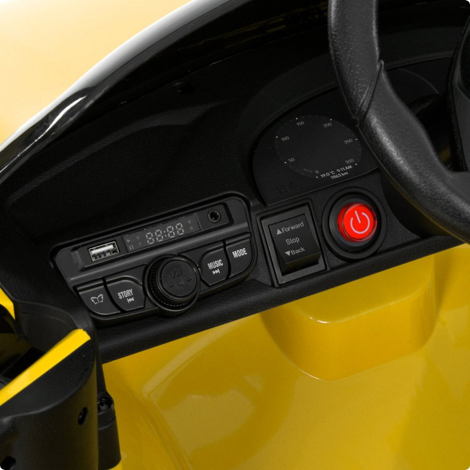 Плавний старт гарантує м’який початок руху без ривків. Керування можливе як дитиною за допомогою педалі газу та тумблера вперед/назад, так і батьками через пульт 2,4G з кнопкою екстреної зупинки.