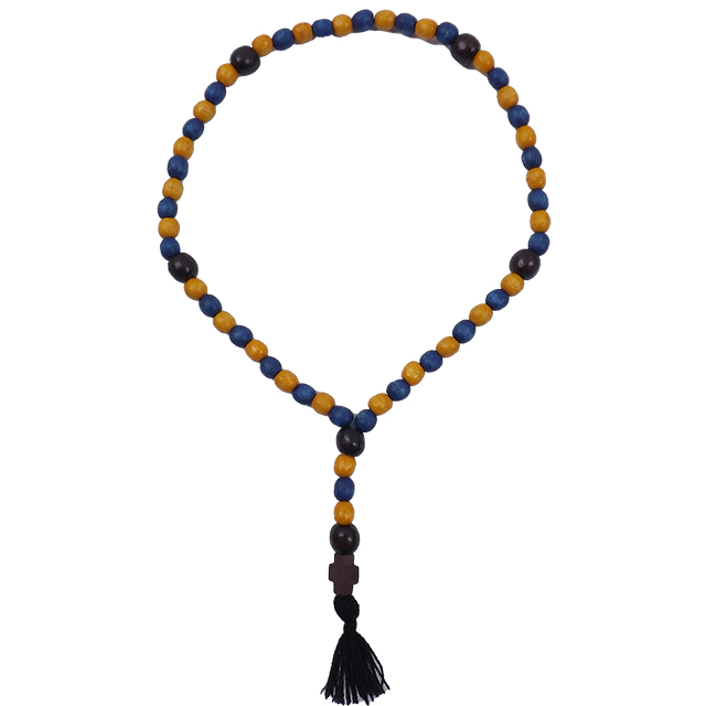 Чотки на 33 намистини дерев'яні з хрестиком синьо-жовті (розм.37см довжин.чоток,/D 0.8см)