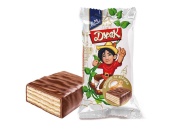 Склад: цукор, жир рослинний (пальма, соняшник), молоко сухе знежирене, горіх фундук смажений тертий (9%), шоколад молочний (5%) (цукор, какао-масло, молоко сухе незбиране, какао терте, сироватка молочна суха, емульгатор лецитин соєвий, сіль кухонна, ароматизатор ванілін), какао-порошок зі зниженим вмістом жиру 10-12% (5%), емульгатор лецитин соєвий, сіль кухонна.
