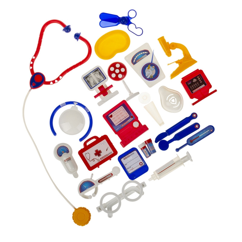 С самого раннего детства ребенок, играя, видит себя спасателем или пожарным, строителем, который возводит небоскребы, или врачом, помогающим другим людям победить болезнь. Такие игры уже с детства формируют у малыша представление о будущей профессии.Вот таким мечтателям и пригодится набор "Маленький доктор", - в нем есть все необходимое для врача: очки, рентген-аппарат, компьютер, измеритель пульса, пилюли (2 дет.), шприц, стакан, ножницы, градусник, ложечка, скальпель, рефлектор, бейджик, фонендоскоп, ванночка, микроскоп, весы напольные, тонометр, лампа, чемодан, телевизор, маска. С таким набором можно смело лечить всю семью — болезнь не устоит!Все элементы набора изготовлены из качественного, прочного и долговечного пластика, без добавления вредных примесей и красителей, совершенно безопасного для здоровья малыша.