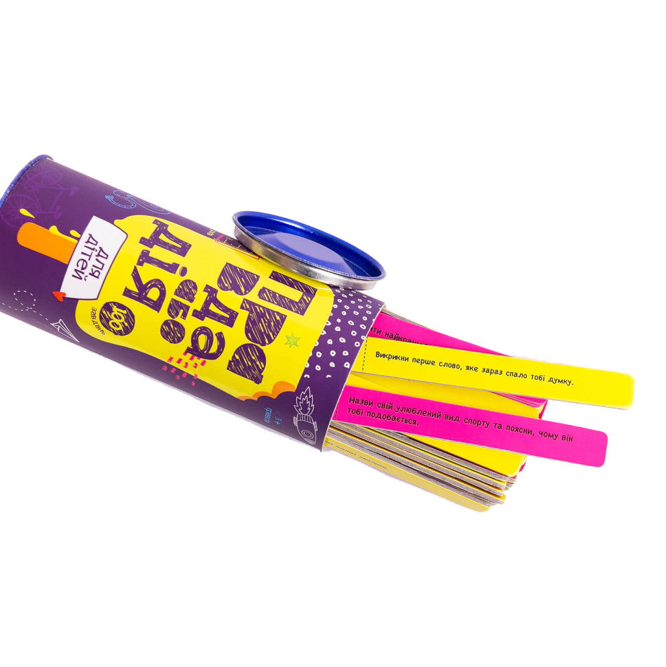 Правда или Дело «Для Детей» - игра, с которой ваши дети и их друзья точно не соскучатся. Отлично подойдет чтобы развлечь ваших непосед, а также для любого детского праздника. Сыграв в эту игру, ребятишки зарядятся позитивом на долгое время и получат максимум эмоций.Коротко о правилах: Вы по очереди спрашиваете друг друга «Правда или Дело?». Если выбрали «Дело» - тяните стик и выполняйте задание с его желтой стороны. «Правда» - вам необходимо ответить на вопрос с розовой стороны. Вы не можете выбирать одно и тоже задание более двух раз подряд. Вы в праве отказаться от любого задания или ответа на вопрос, но не более двух раз за игру.Тип игры: Для детей 8-13 лет, семейнаяКоличество участников: 3+В комплекте: 50 вопросов и 50 делМатериал: Ламинированный картонПроизводитель: Fun Games Shop, Украина