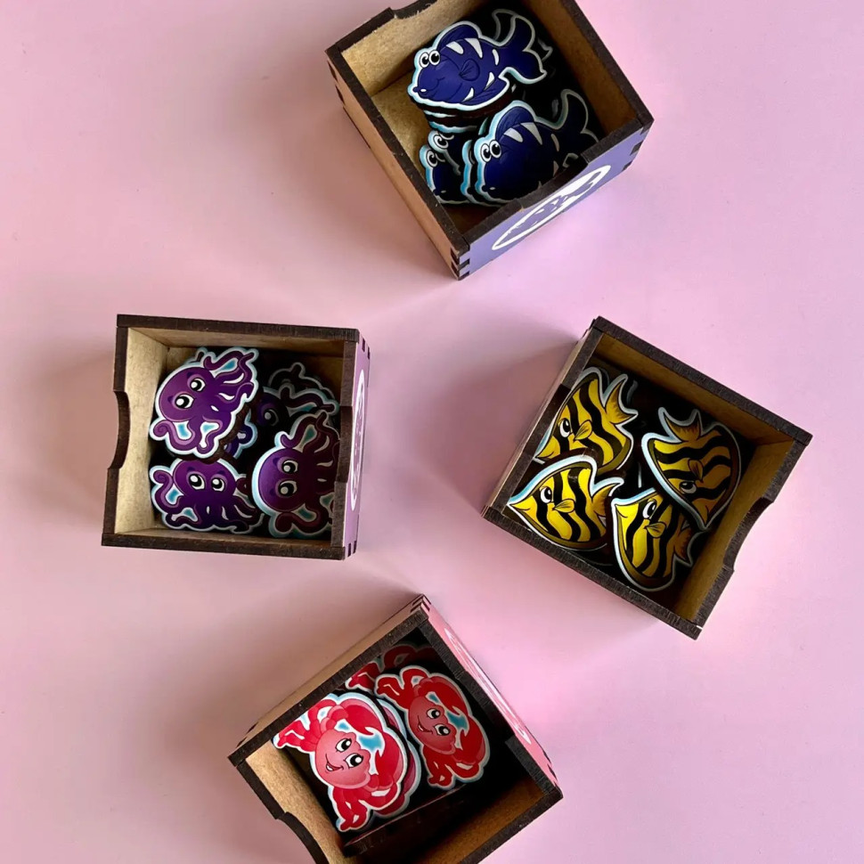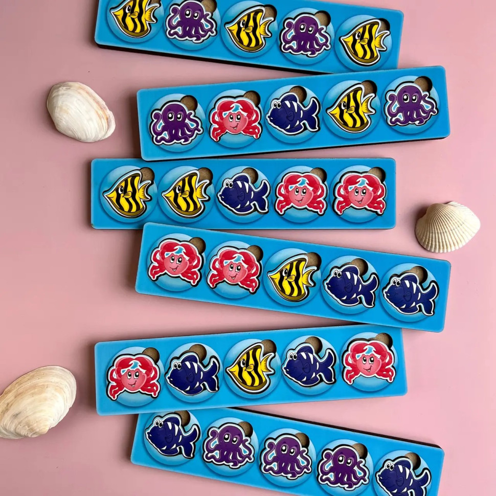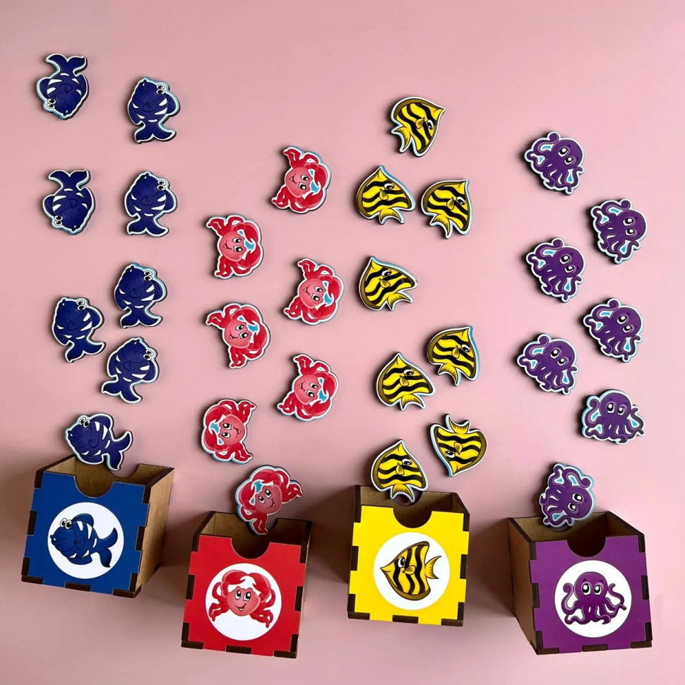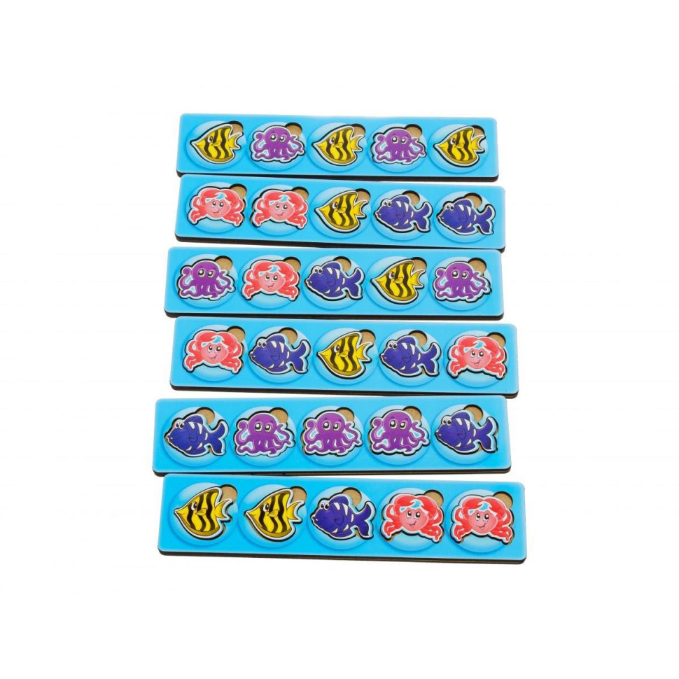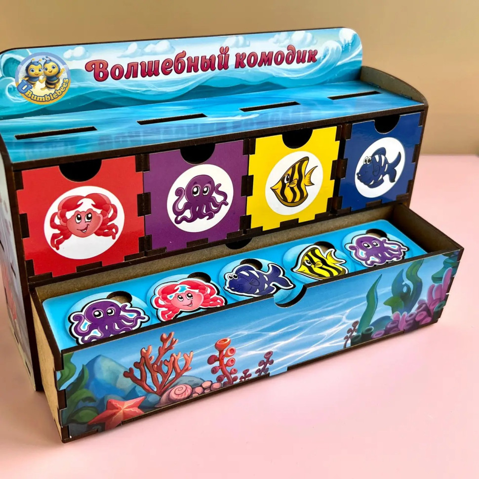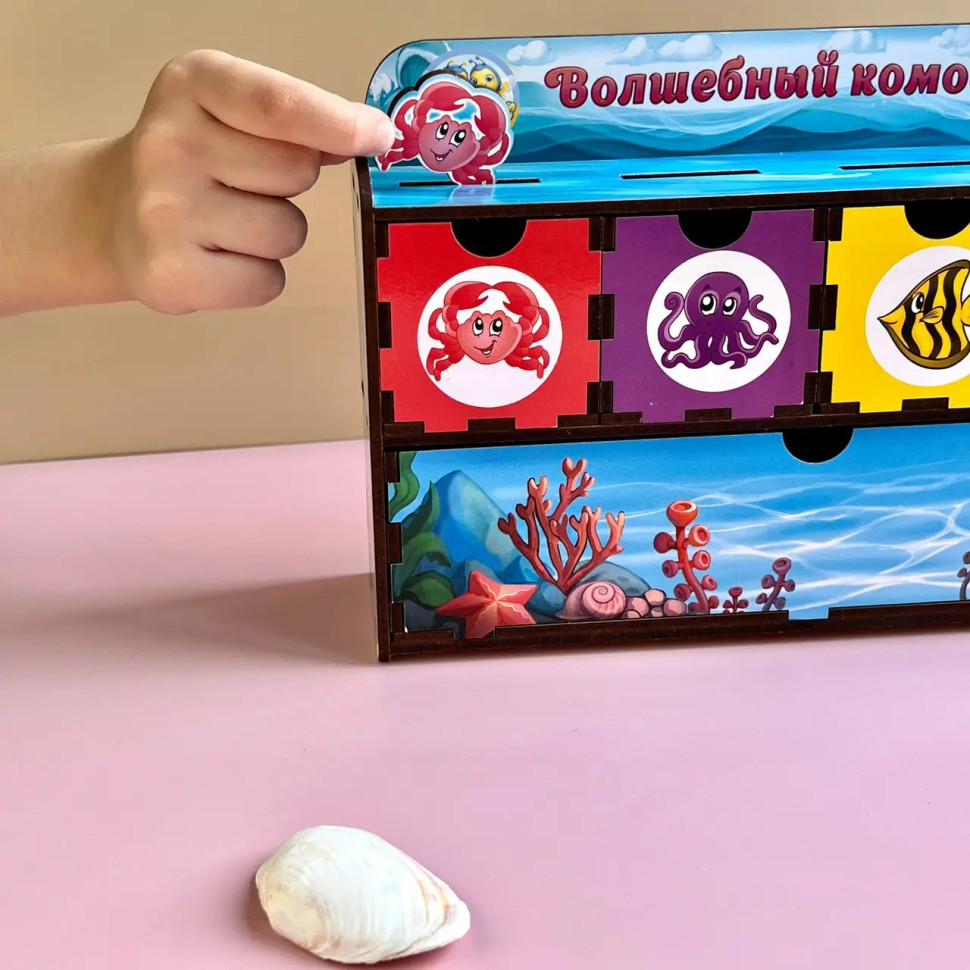 Комод состоит из 4 тематических ящиков для сортировки вкладышей по цвету, рисунку и 1 ящика, где находятся планки для укладки. В наборе 6 планок и 30 фигур морских обитателей для сортировки.
