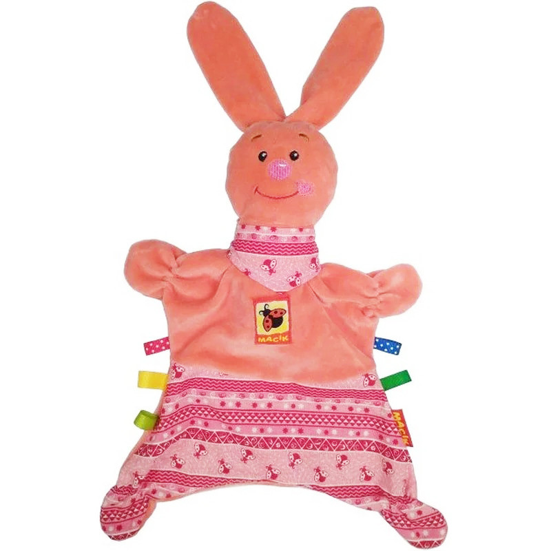 С 3 месячного возраста обнимашка поспособствует развитию слуха, зрения, сенсорно-моторного восприятия. Для этого у зайчика есть фактурная спинка, цветные узоры, пищалка, лапки-тянучки и петельки.