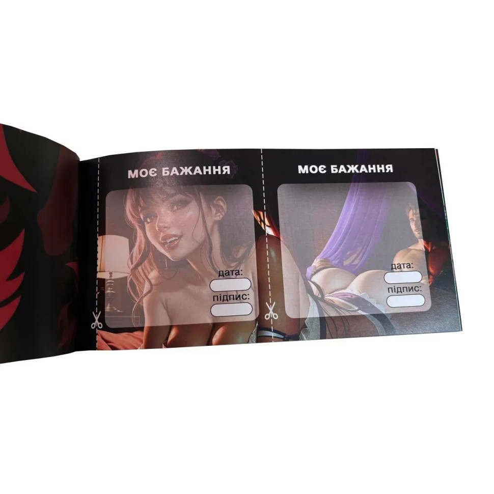 Чековая книжка желаний для влюбленныхПеред вами чековая книжка эротических желаний, в которой собрано 50 чеков.Среди них 9 чеков открытого типа, куда вы можете самостоятельно вписать желание. Также есть наклейки "ТАБУ" (три для парня, и три для девушки), с помощью которых каждый может деактивировать определенное количество чеков.Яркие иллюстрации будут возбуждать ваши чувства, еще на этапе выбора чека.Чековая книжка желанийЧто внутри книжки?50 чеков разделены на три категории, от простых до откровенных и очень смелых.В каждой категории есть три открытые (пустые) чеки, куда вы можете вписать свое желание, или повторить один из уже использованных чеков.В конце книги - страница с наклейками "ТАБУ". Три для парня, и три для девушки. Используйте наклейки для того, чтобы деактивировать чек, который вам не подходит, или вы категорически против.Чековая книжка секс желаний Чековая книжка секс желаний табуПримеры чековПервый уровеньСекс под открытым небомОтшлепай меня, как следует!Используйте еду во время секса (сливки, мороженое, клубника...)Поцеловать все родинки на теле партнераОткровенный разговор на тему сексуальных фантазийИнтимные фото друг другуВторой уровеньФут-фетишВечер стриптизаСовместная покупка в секс-шопеПробуждение от оральных ласкДень без одеждыРолевая игра (сценарий можете придумать вместе)Минет во время управления автомобилемТретий уровеньИскусство шибариИгры с воскомВыберите сцену из порнофильма, и повторите ееТотальное доминированиеСекс в публичном местеПосещение свингер клуба или БДСМ патиИ другие...Чековая книжка секс желанийЧековая книжка секс желанийДля кого книжка?Чековая книжка желаний рассчитана для влюбленной пары, которая стремится разнообразить свою интимную жизнь. Стремится к чему-то новому и не боится экспериментировать.Размер книги: 20х10 см.Количество чеков: 50 шт.