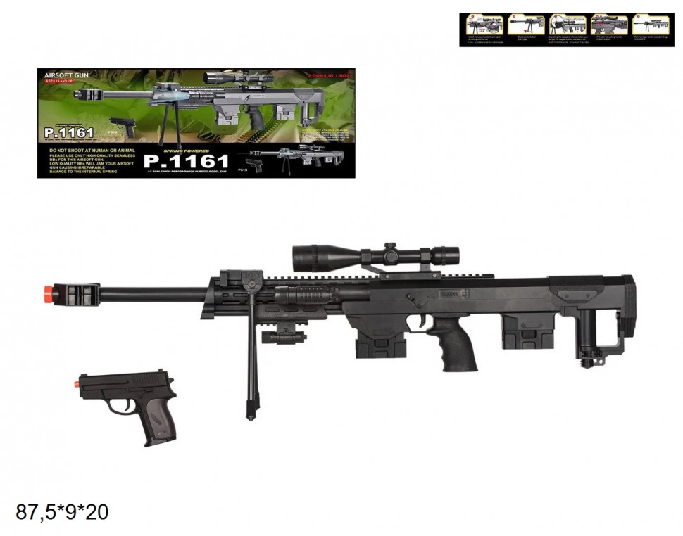 Комплект Р.1161 Автомат с пистолетом 2 в 1 Автомат и пистолет стреляют пластмассовыми пульками BB 6мм, на автомате есть имитация оптического прицела, лазерный прицел, фонарик, сошки для упора при стрельбе, запасной магазин.Размер автомата 82см.Комплектация:автомат;