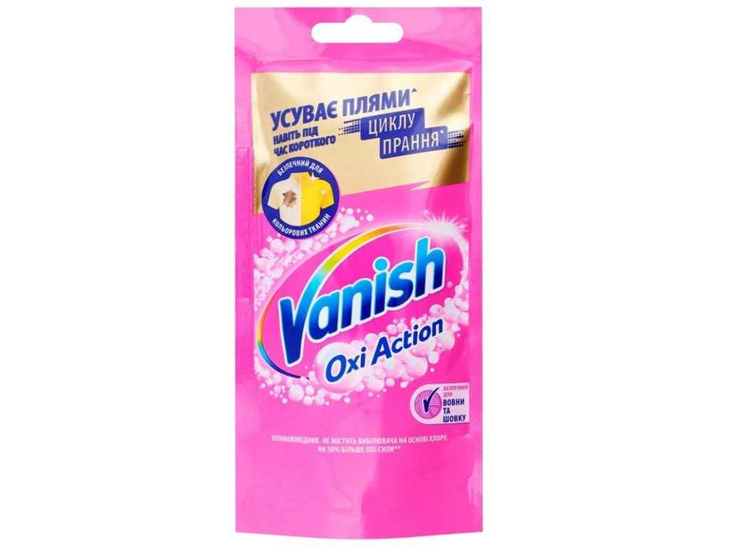 Vanish Oxi Action містить активний кисень, що видаляє плями та зберігає колір ваших речей. Призначений для білої та кольорової білизни, виробів із делікатних тканин, вовни та шовку. Під час прання: додайте до порошку один саше Vanish (100 мл). Під час замочування: 1) розчиніть один саше Vanish (100 мл) у 4 літрах теплої води (не більше 40 °С); 2) замочіть одяг; 3) для кращого результату залиште одяг у воді не більше ніж на 6 годин, кольорові вироби — на годину (уникайте потрапляння прямих сонячних променів). Під час попереднього оброблення: нанесіть Vanish на пляму (суміш не має висихати на тканині!). Під час прання дотримуйтеся рекомендацій, вказаних на етикетці текстильних виробів. Не використовувати разом із засобами, що містять хлор. Перевірити стійкість фарби на непомітній ділянці тканини. Помити і витерти руки після контакту із засобом. У разі потрапляння на шкіру може зумовити тимчасове посвітління. Людям із чутливою шкірою рук рекомендовано користуватися гумовими рукавичками. У разі потрапляння засобу в очі — негайно промити великою кількістю води. Уникати потрапляння бруду та вологи у паковання. Зберігати у захищеному від світла місці.