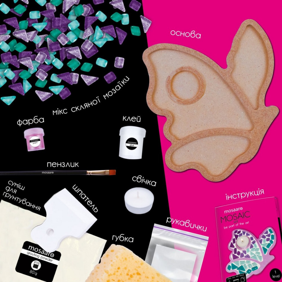 Детали мозаики приятны на ощупь, удобны и безопасны в работе.В наборе вы найдете все необходимое для создания шедевра, а также пошаговую инструкцию с иллюстрациями.Творческий процесс гарантированно доставит удовольствие, а готовое изделие станет прекрасным дополнением к интерьеру.Выбирайте креативные наборы Mosaaro для себя или в подарок!На каждой коробке есть QR-код, который приведет вас на ютуб-канал Mosaaro. Там вы найдете видео-инструкцию на каждый набор.Размер готового изделия: 165х170 мм.Комплектация: основа, микс стеклянной мозаики, свеча, смесь для грунтовки, перчатки, губка, краска, кисточка, клей, шпатель, инструкция.Язык: лицевая сторона — английский, маркировка — мультиязычная.Возраст: 7-99 лет.