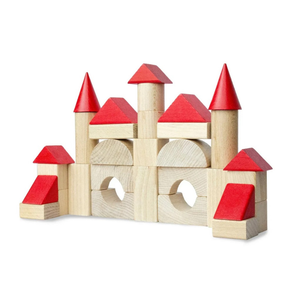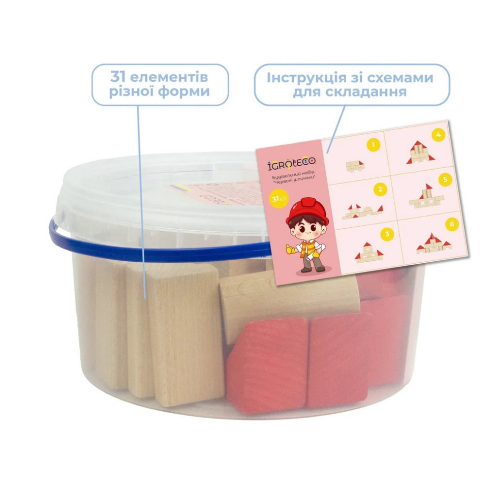 Строительный набор Красные шпильки – деревянная развивающая игрушка с фантазиейСтроительный набор Красные шпильки на 31 элемент – это оригинальная детская игрушка из дерева, которая стимулирует воображение, креативность и логику. Все элементы созданы из натуральных материалов: безопасны, приятны на ощупь и очень прочные.Комплектация игрушкиВ наборе – 31 геометрический элемент:квадратные блокипрямоугольники и цилиндрыконусыарочные мостикиуникальные шпильки красного цветаВсе аккуратно сложено внутрь удобного ведерка для хранения. В комплекте есть инструкция с примерами сооружений, но главное – это свобода творчества: ребенок может создавать различные сооружения – от небольших домиков до реальных замков или башен.Преимущества конструктора Красные шпилькиизготовлен из натурального дереваэкологичный, безопасный материалразвивает пространственное мышление, моторику, алгоритмическое мышлениеспособствует обучению через игруподходит детям в возрасте от 3 лет