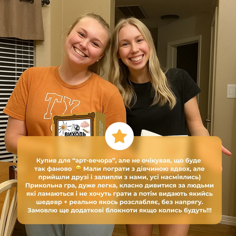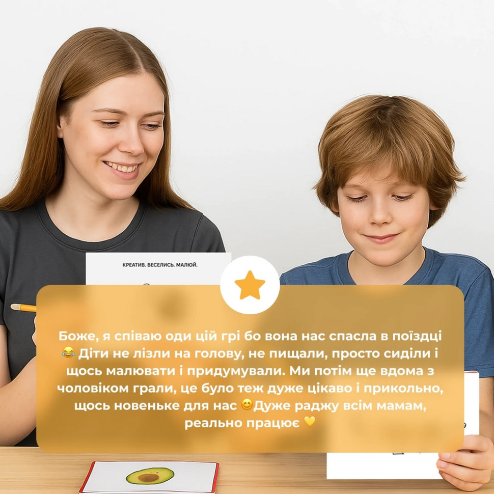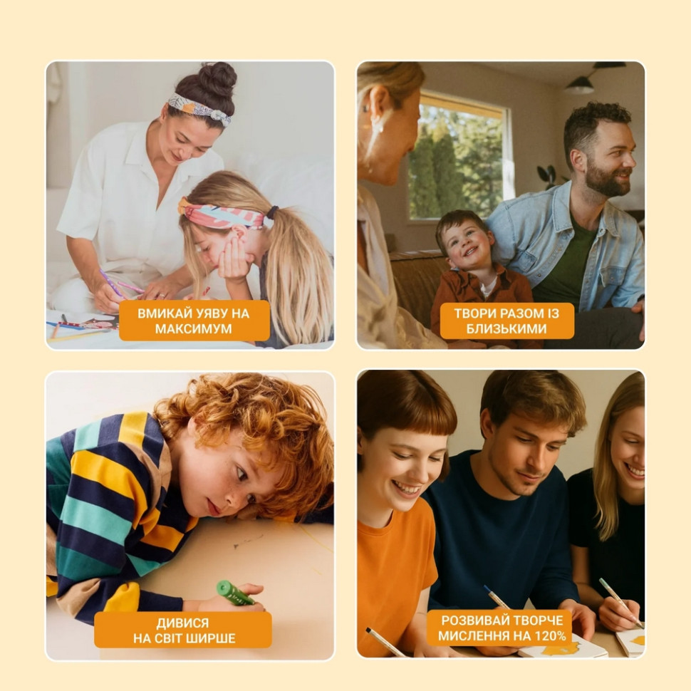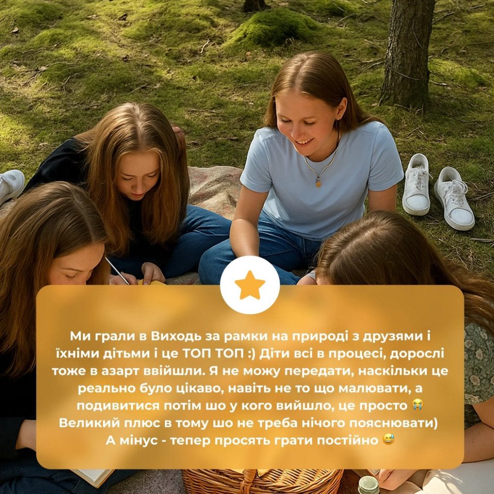 Стимулируйте воображение и креативное мышление"Выйди за рамки" — это игра, которая помогает детям развивать воображение и мыслить нестандартно.Как работает играРазвивайте креативность и вдохновляйтесь вместеВаш ребенок проявляет нестандартное мышление, превращая 40 уникальных картинок в сотни уникальных идей.Как это работаетРастите через игру и наслаждайтесь процессомКаждый раунд игры – это новый вызов, который развивает креативность, гибкость мышления и умение находить нестандартные решения. Игра превращает обучение в увлекательное приключение.