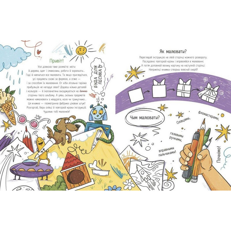 Ваш ребенок уже замечает, сколько всего интересного вокруг него? Тогда пришло время научиться все это еще и рисовать! И эта книга-раскраска покажет, что это совсем не сложно, если начинать с геометрических фигур. На страницах есть пошаговые инструкции, повторяя которые удастся нарисовать и подсолнух, и груша, и мороженое, и даже робота. Первый шаг — это всегда геометрическая фигура, которую ребенок точно уже умеет рисовать: круг, квадрат, треугольник... А когда добавить немного деталей, цветов и воображения — получается прекрасная картинка.