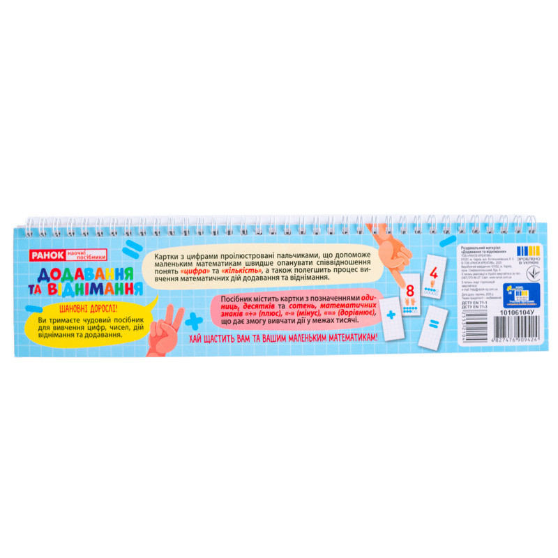 Это красочное наглядное пособие создано для легкого и эффективного знакомства детей с цифрами, числами и основными математическими действиями. Благодаря удобному формату на пружине, карточки удобно листать, они не теряются и выдерживают активное использование в обучении или игре.