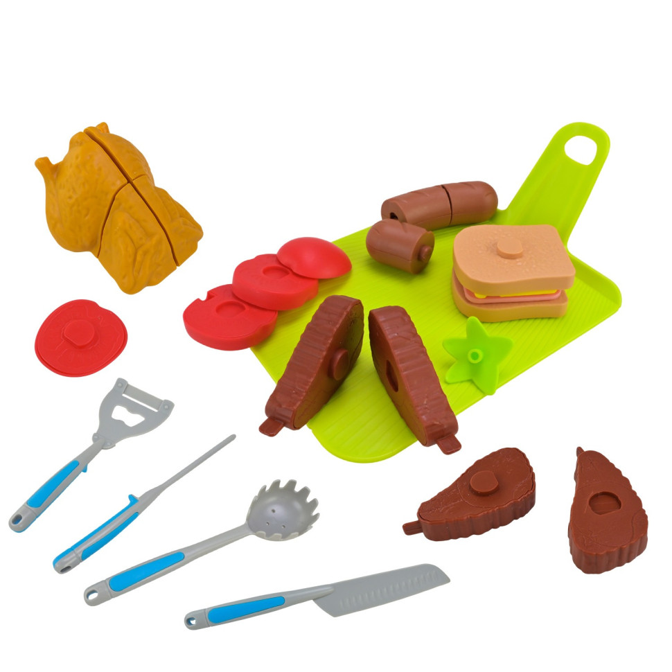 Игрушечный набор продуктов — это настоящее кулинарное приключение для маленьких шеф-поваров! Доска с разнообразными продуктами позволяет ребенку почувствовать себя на настоящей кухне, где можно сочетать части еды и создавать собственные блюда.Комплектация:• Доска;• 4 столовых прибора;• 20 элементов еды.Особенности:• Привлекательный и реалистичный дизайн продуктов делает процесс сюжетной игры еще более увлекательным и интересным.• Разнообразная еда выглядит как настоящая, в наборе есть сэндвич, курица-гриль и мясо — все это состоит из частей и соединяется между собой, как конструктор.• Благодаря столовым приборам и удобной дощечке продукты можно безопасно «разрезать», создавая различные кулинарные истории.• Удобный размер для детских рук.• Изготовлен из безопасных материалов, приятных на ощупь.Развитие: мелкая моторика, логика, мышление, фантазия, а также ребенок учится творчески подходить к процессу приготовления пищи, развивает желание помогать в домашних делах.Упаковка: коробка