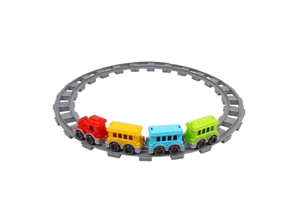 У наборі 16 елементів: локомотив, 3 яскравих вагончики та 12 елементів залізниці, які легко зєднуються, як пазли.