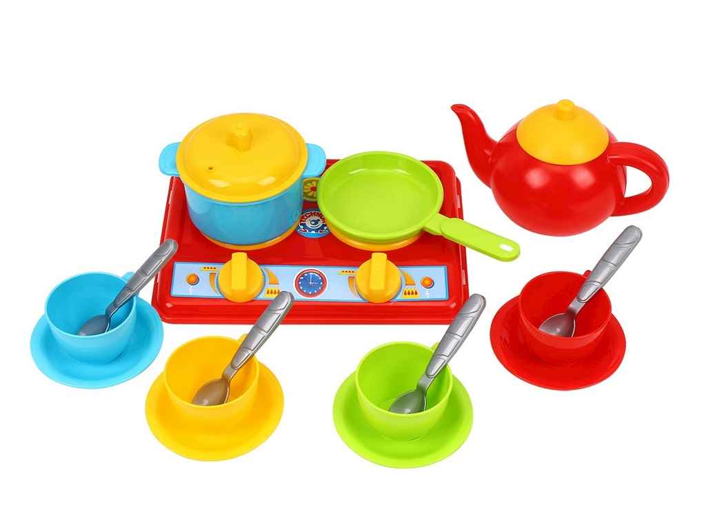 У комплект входить варильна поверхня, 4 чашечки, 4 блюдечка, 4 ложки, чайник, каструля та сковорідка.