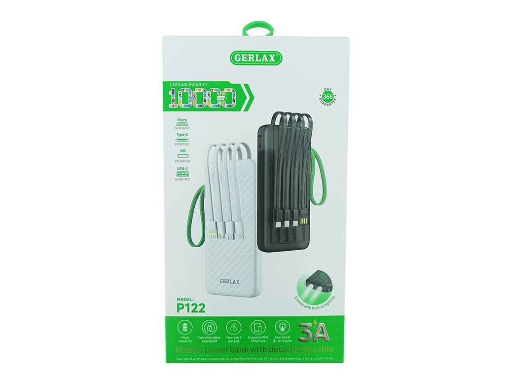 Power Bank 10000mAh P122 1USB/3A/ліхтарик/кабель 4в1(microUSB/type-C/lightning) чорний ТМ GERLAX
