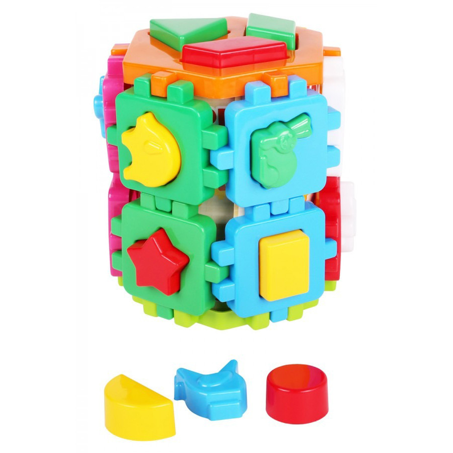 Куб-конструктор с разнообразными геометрическими фигурками и фигурками животных, которые вставляются в соответствующие отверстия основы. Развивает логическое мышление, моторику пальцев, память.Размер игрушки: 17х14х14 см.